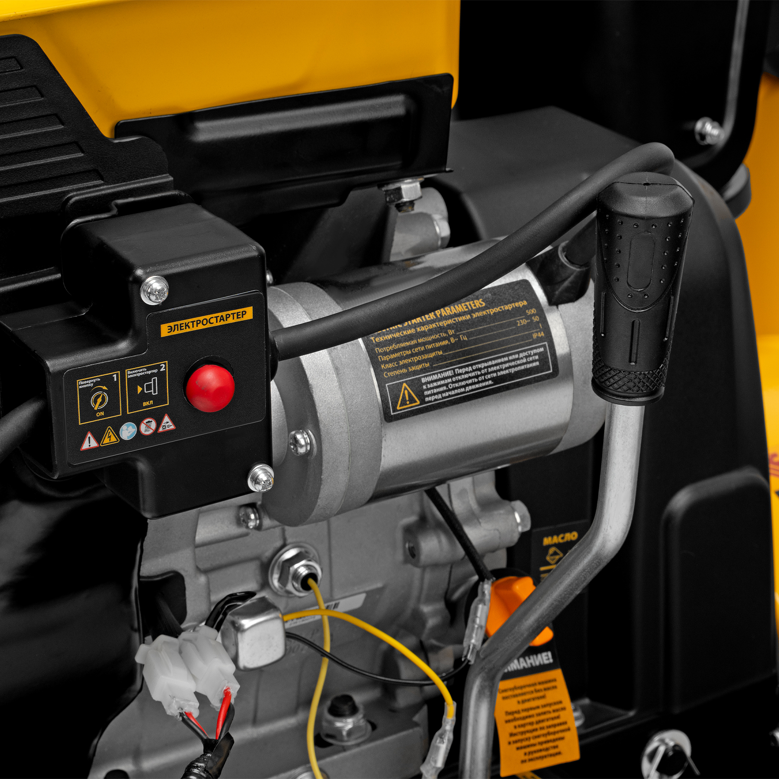 - Электростартер — для быстрого запуска двигателя достаточно подключить машину к розетке 230 В и нажать на кнопку.