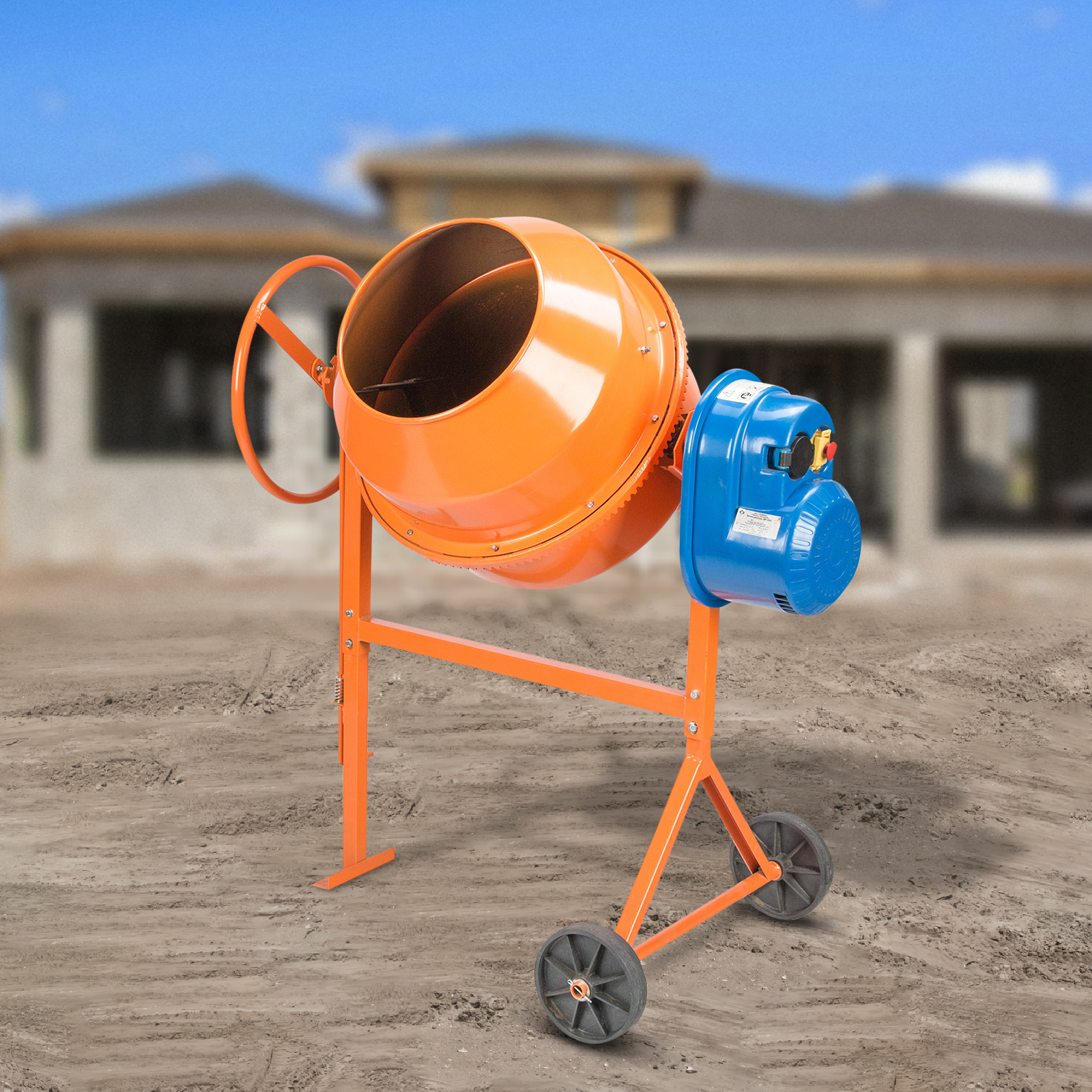 - Комфортное перемещение по строительной площадке — бетоносмеситель оснащен большими колесами.