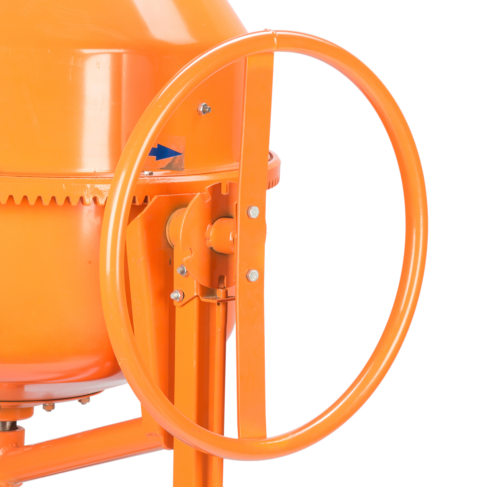 - Прочная конструкция — бетоносмеситель имеет стальную раму и усиленные профили траверсы, втулка оси траверсы наварена на раму отдельным элементом, венец крепится к барабану с помощью внешних проушин, а металлическая опора обеспечивает устойчивость бетономешалки
