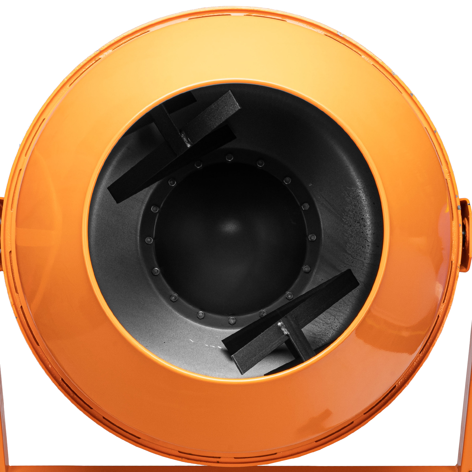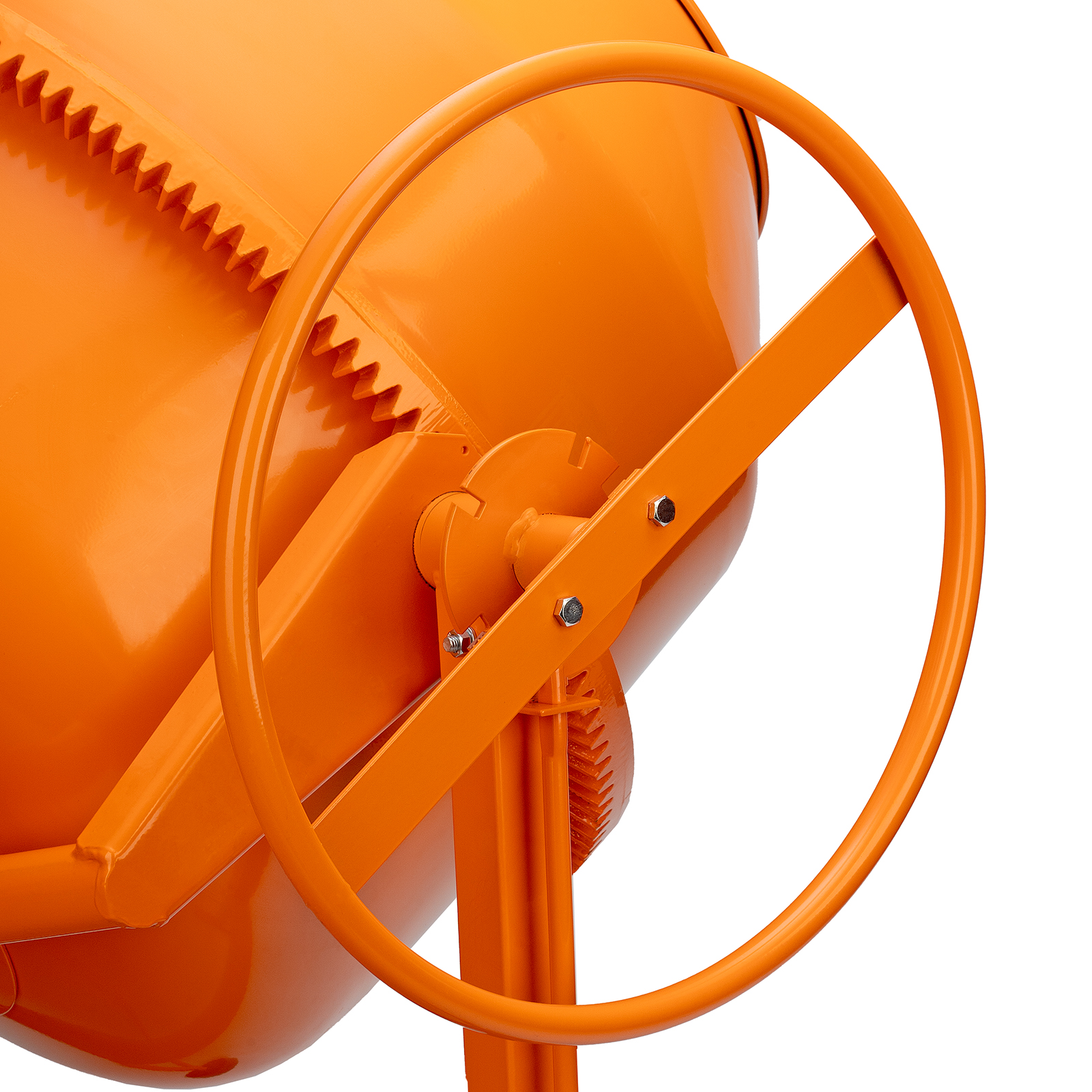 - Прочная конструкция — бетоносмеситель имеет стальную раму и усиленные профили траверсы, втулка оси траверсы наварена на раму отдельным элементом, венец крепится к барабану с помощью внешних проушин, а металлическая опора обеспечивает устойчивость бетономешалки
