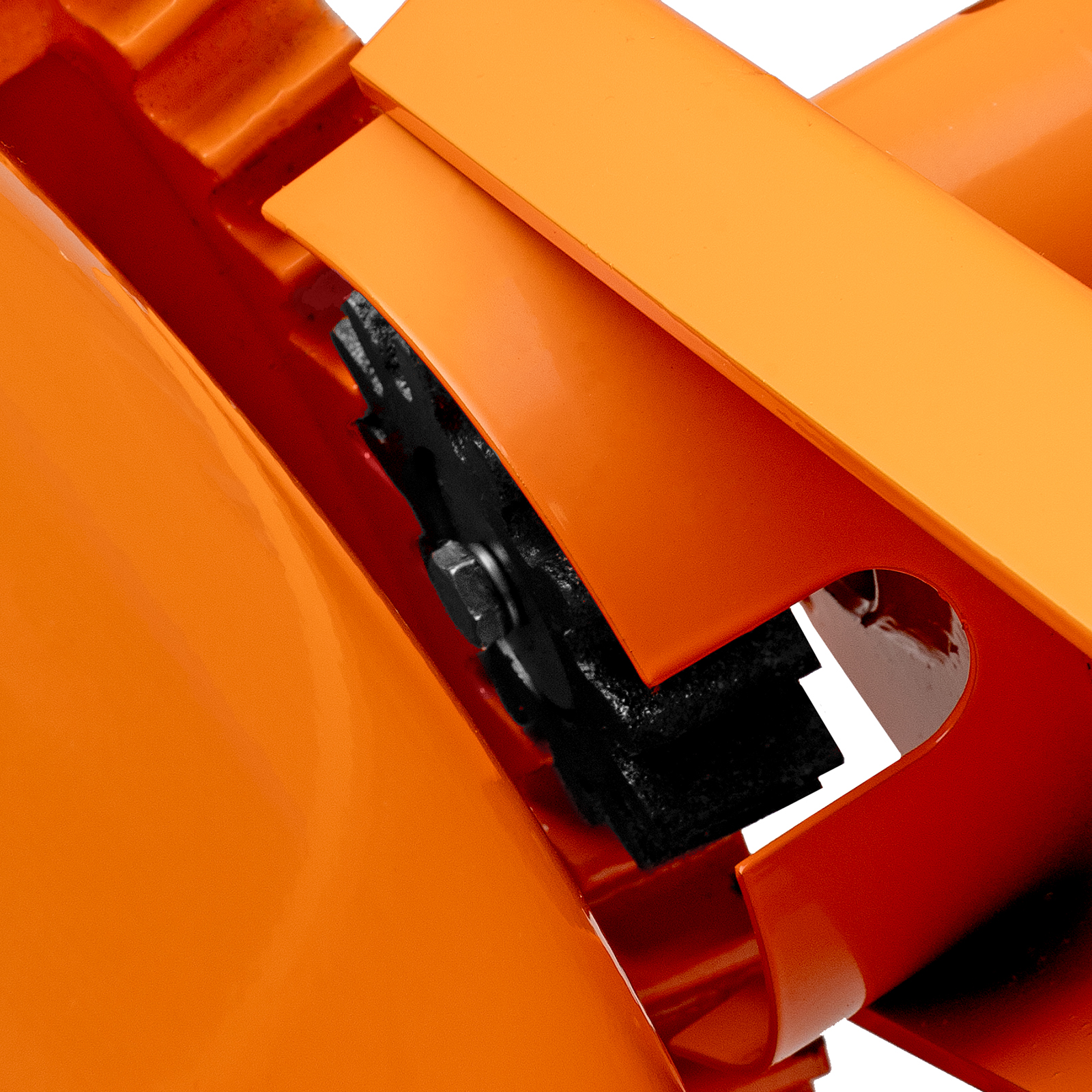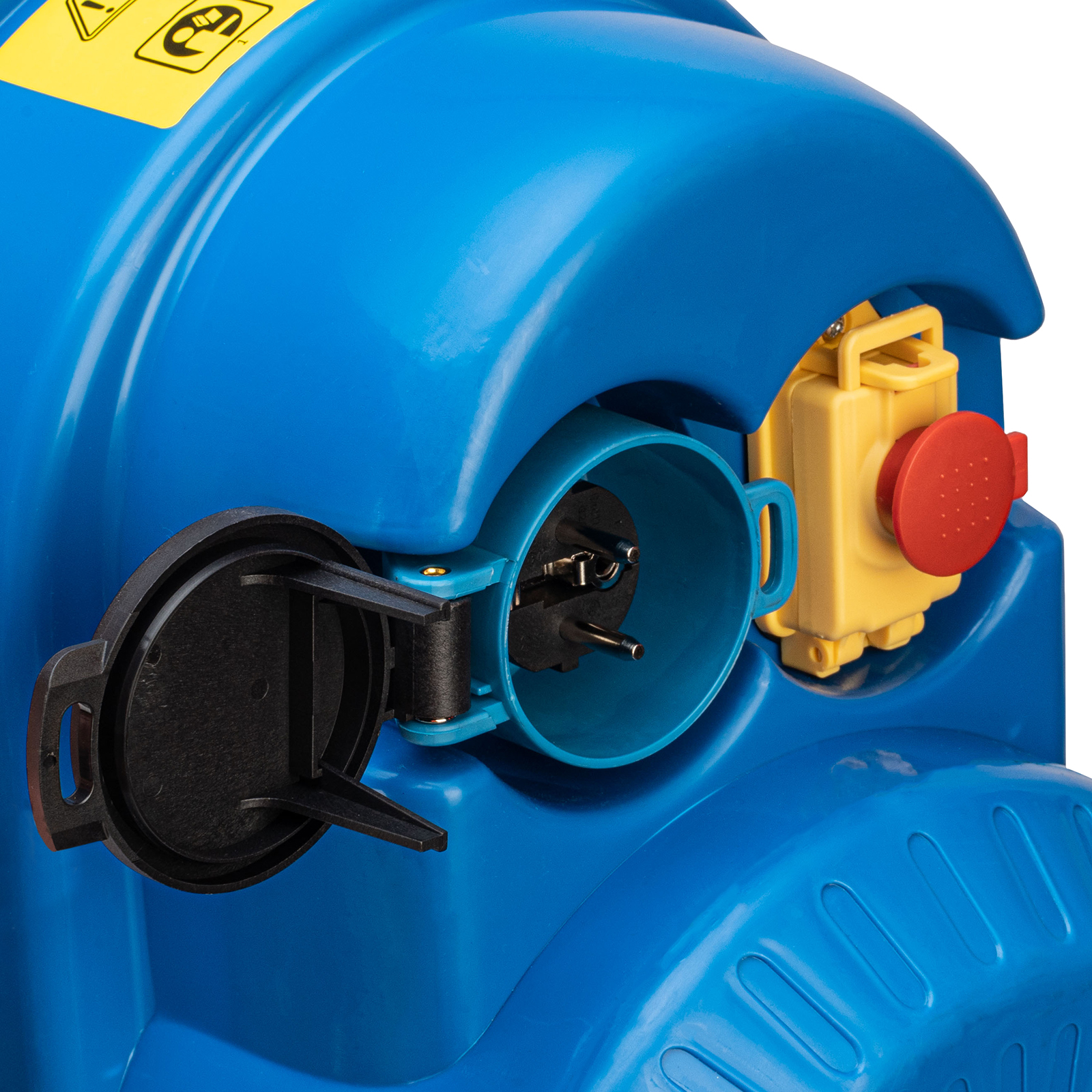 - Безопасная работа — стальной вертикальный элемент траверсы защищает привод бака от затягивания посторонних предметов, выключатель закрыт крышкой для предотвращения случайного запуска.
