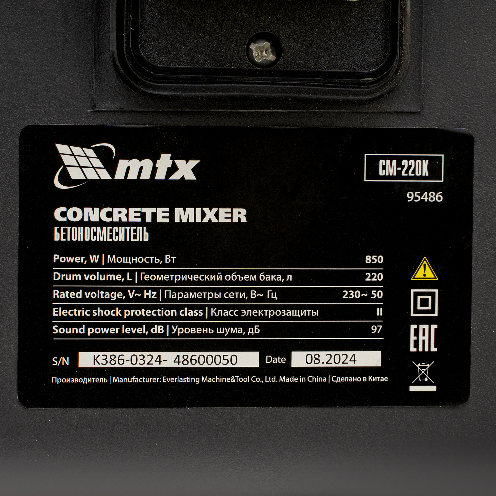 Бетоносмеситель MTX CM-220K 95486 мощностью 850 Вт, с баком на 220 л, предназначен для приготовления бетонных смесей и штукатурных растворов. Оптимальное соотношение мощности двигателя и объема бака обеспечивает высокую скорость перемешивания и надлежащее качество полученной смеси. Максимальный объем готового раствора составляет 147 л. Бетоносмеситель будет полезен на строительной площадке.