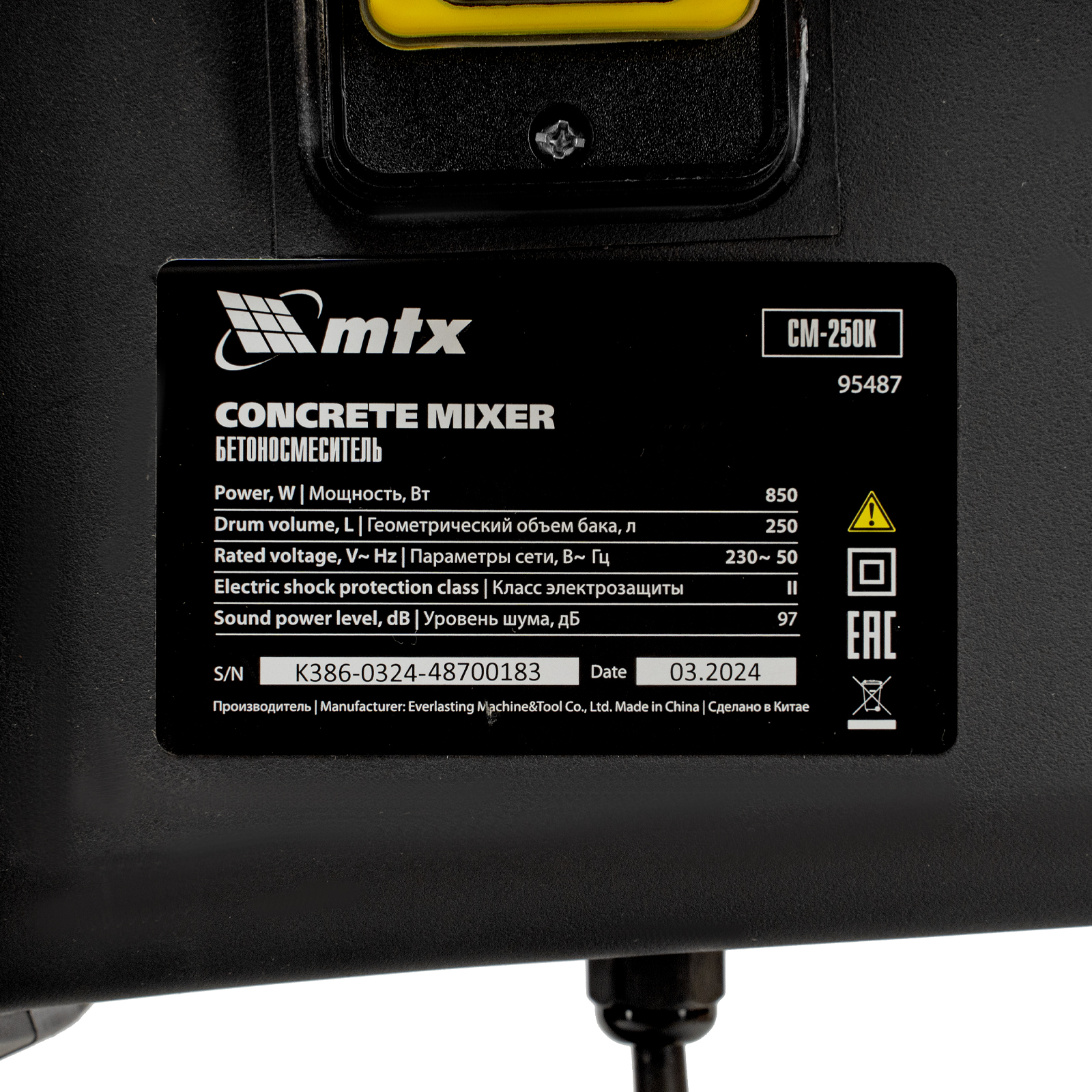 Бетоносмеситель MTX CM-250K 95487 мощностью 850 Вт, с баком на 250 л, предназначен для приготовления бетонных смесей и штукатурных растворов. Оптимальное соотношение мощности двигателя и объема бака обеспечивает высокую скорость перемешивания и надлежащее качество полученной смеси. Максимальный объем готового раствора составляет 165 л. Бетоносмеситель будет полезен на строительной площадке.