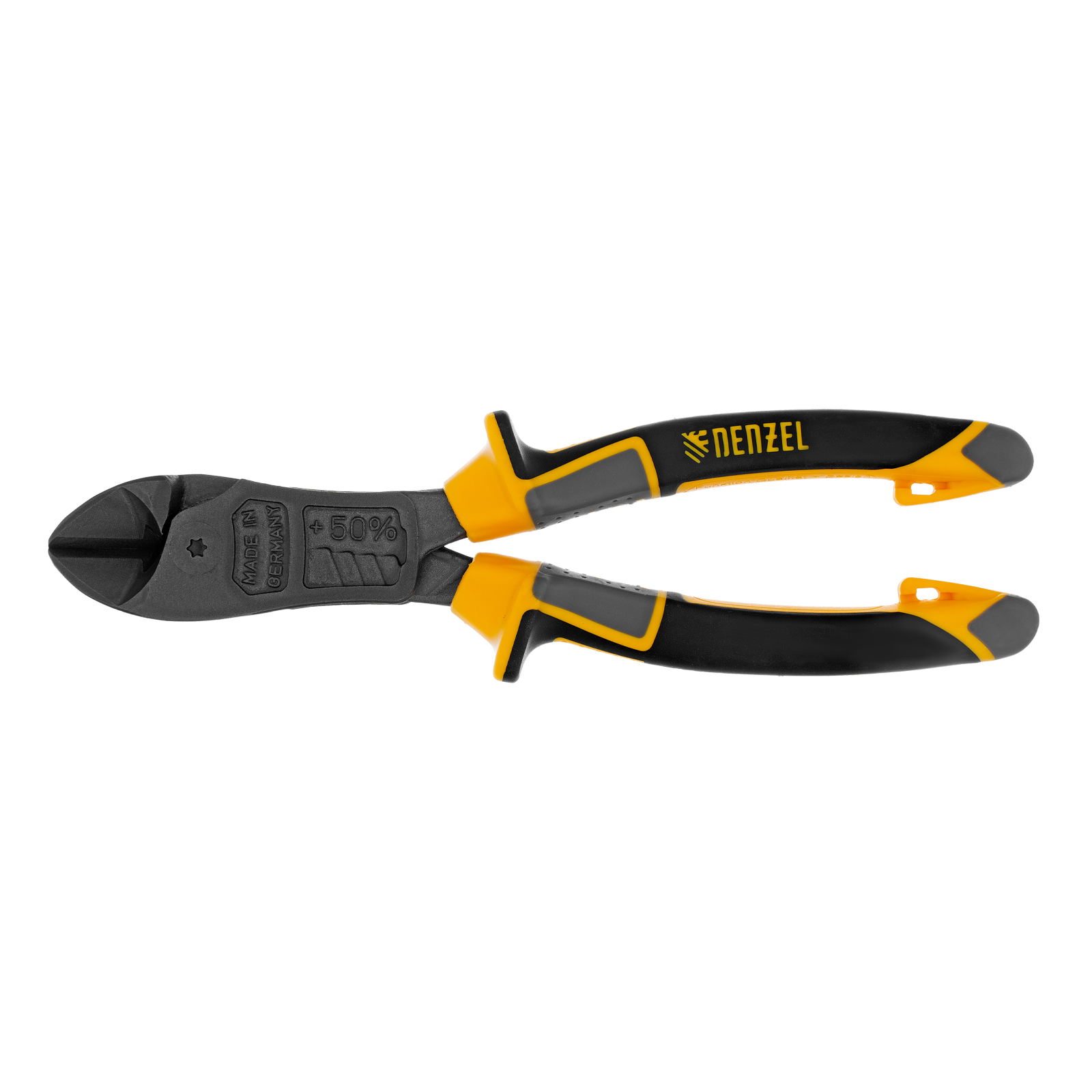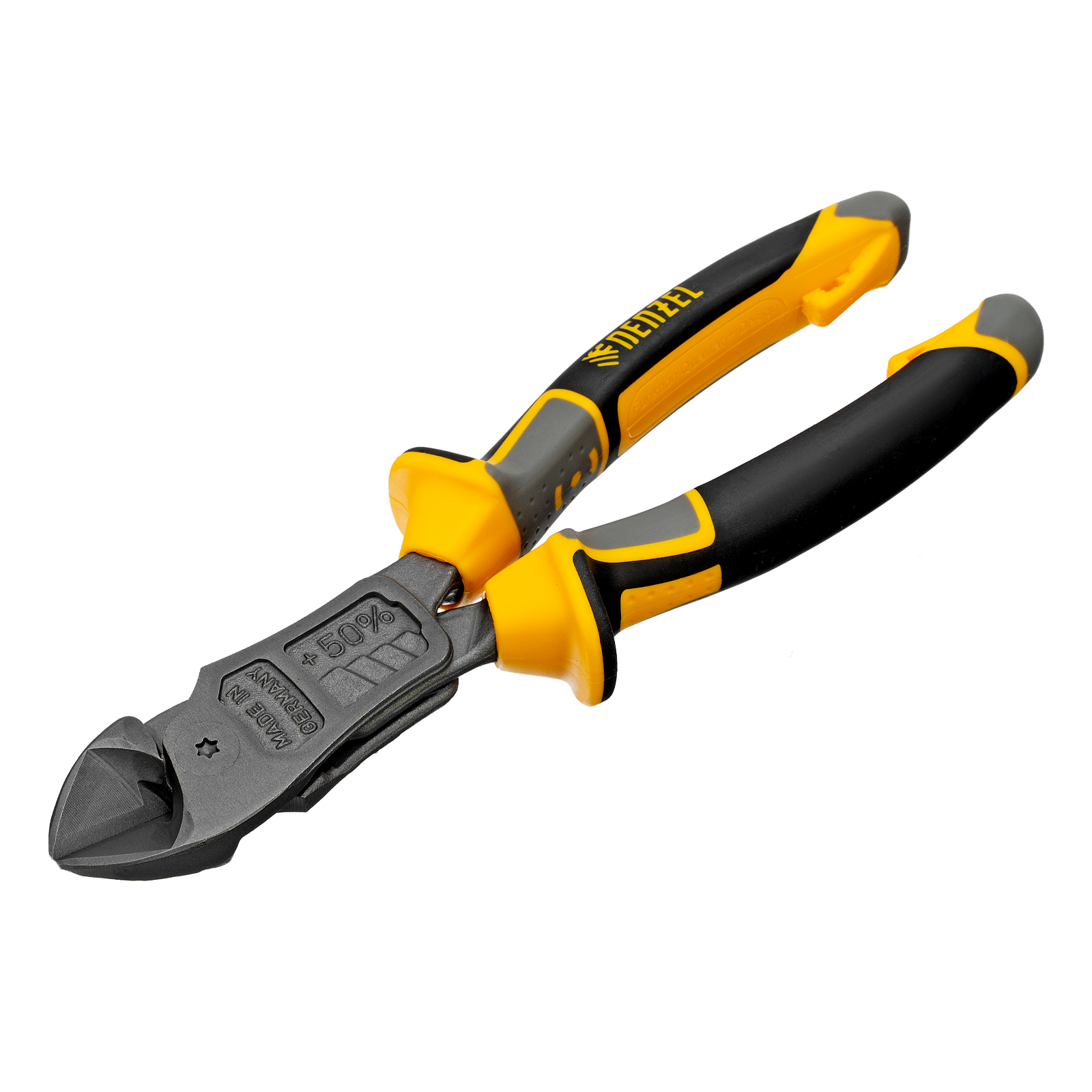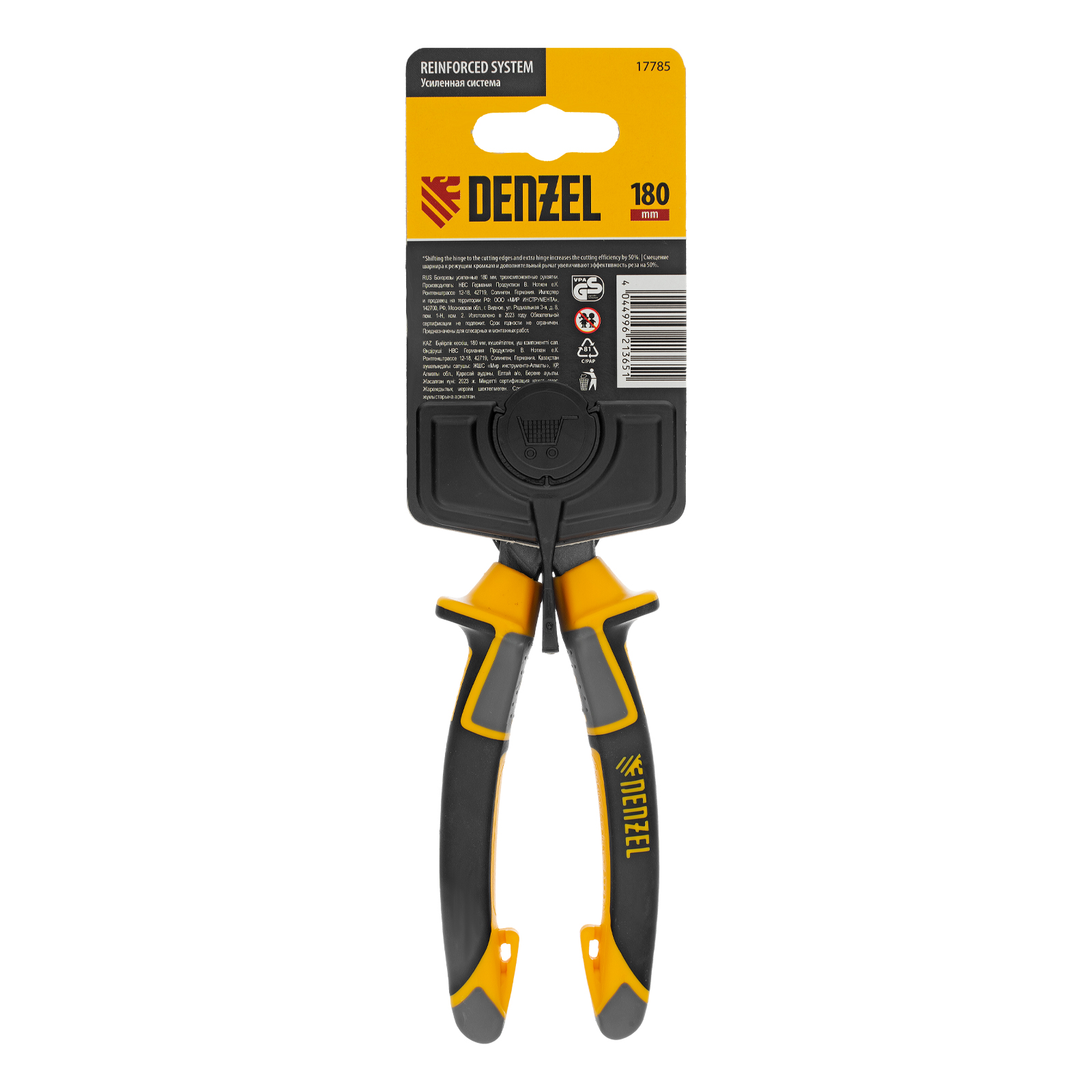 Усиленные бокорезы Denzel 17785 длиной 180 мм, с трехкомпонентными рукоятками, предназначены для разрезания кабелей, проводов, гвоздей и проволоки средней (750 Н/мм2) и высокой жесткости (1800 Н/мм2) диаметром 4 и 2,8 мм соответственно. Подходят для резки рояльных струн (предел прочности 2300 Н/мм2) диаметром до 2,5 мм. Успешно справляются не только с медными, алюминиевыми и пластмассовыми деталями, но и с более жесткими стальными элементами. Встроенный рычажный механизм и смещенный непосредственно к режущим кромкам шарнир увеличивают усилие реза на 50%.
