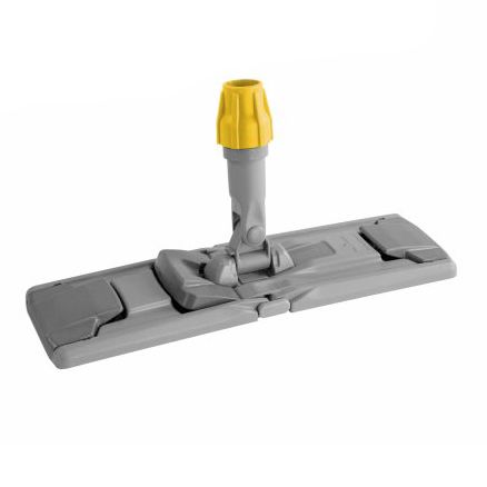 Желтый держатель мопов (флаундер) c механизмом складывания и зажимами предназначен для всех плоских мопов размером 36 см. Используется для влажной уборки и дезинфекции пола. Ширина захвата мопа 36 см, что обеспечивает равномерный прижим мопа по всей плоскости. На верхней части основы размещена кнопка, которая переключается с помощью ноги, позволяя легко складывать основу для снятия или отжима мопа. Универсальный крепежный винт позволяет использовать ручки диаметром от 20 до 24 мм. Держатель изготовлен из лёгкого и ударопрочного материала, выдерживает низкие температуры. Состоит из разборных материалов и легко сортируется для переработки в конце службы.