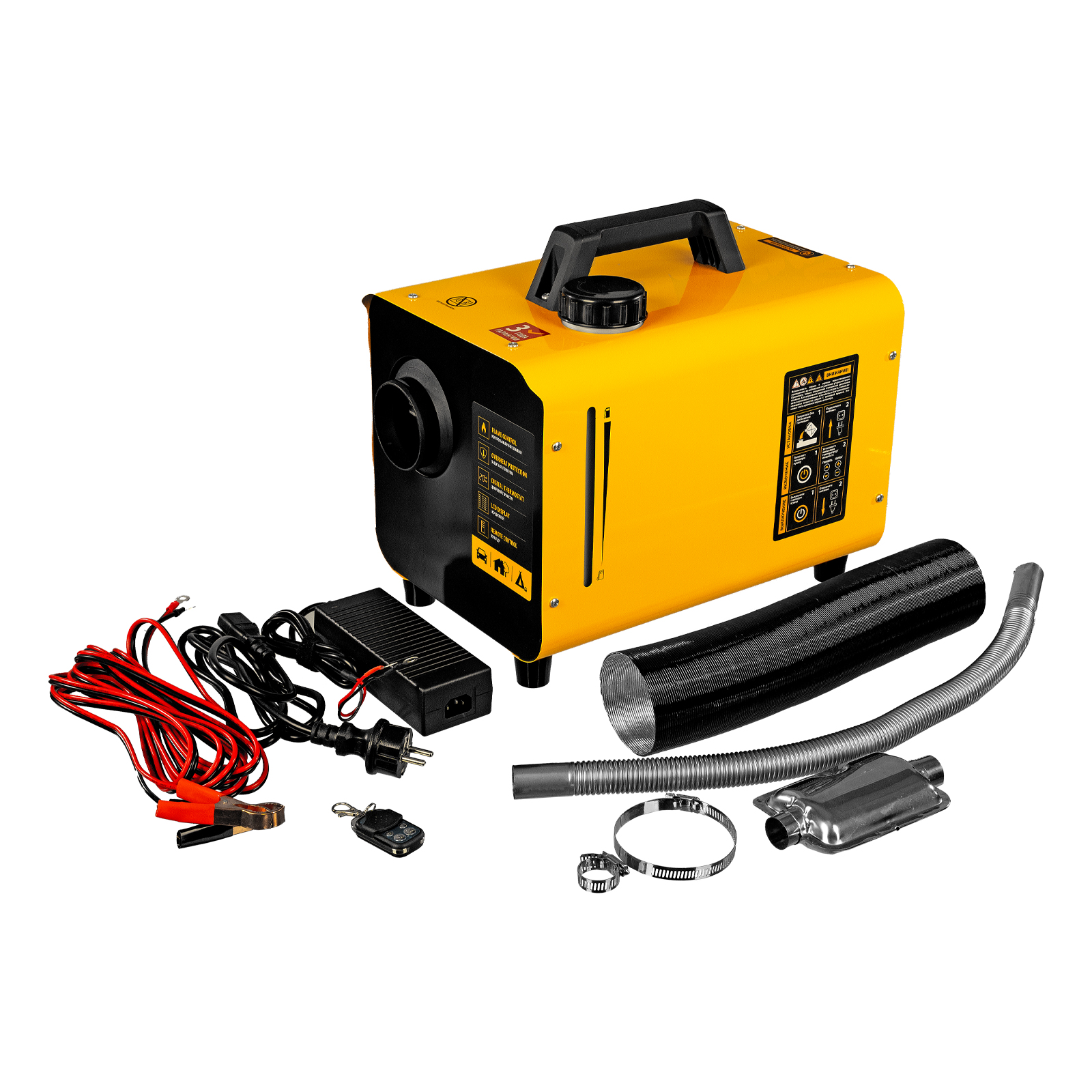 Дизельная тепловая пушка - 1 штГофрированная труба (для воздуховыпускного отверстия) - 1 штТруба отвода выхлопных газов(для выхлопного отверстия) - 1 штХомут для труб Ø19-Ø29 - 2 штХомут для труб Ø60-Ø83 - 1 штПодставка - 1 штГлушитель - 1 штКабель питания с клеммами для аккумулятора 12 В – 5 м - 1 штБлок питания 230 В~ 50 Гц 12 В – 3 м - 1 штПульт ДУ - 1 штРуководство по эксплуатации с гарантийным талоном - 1 шт |
