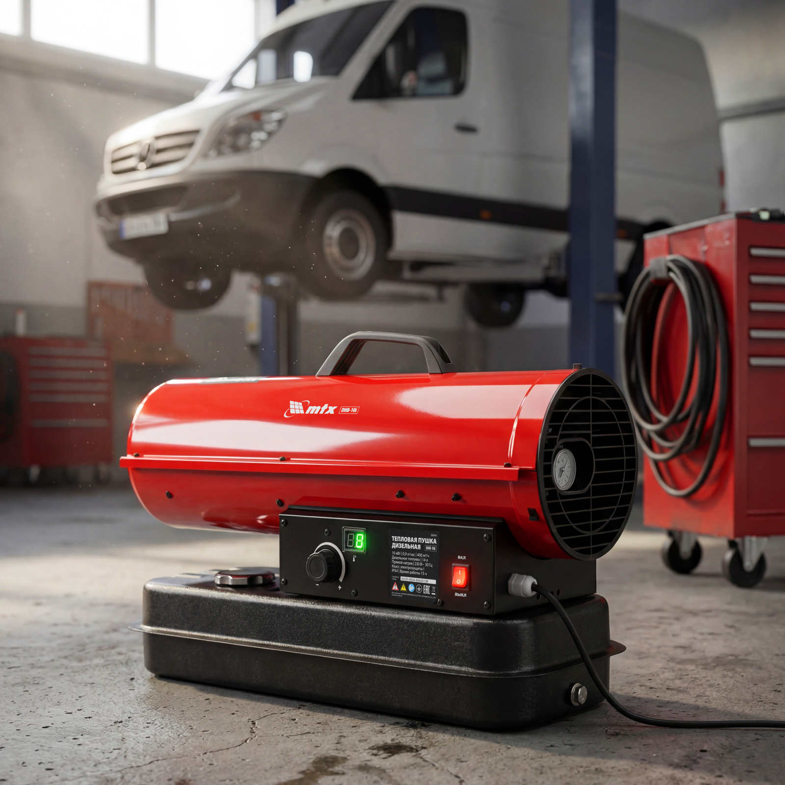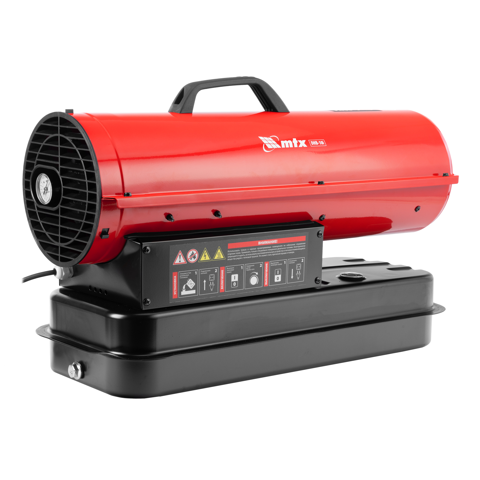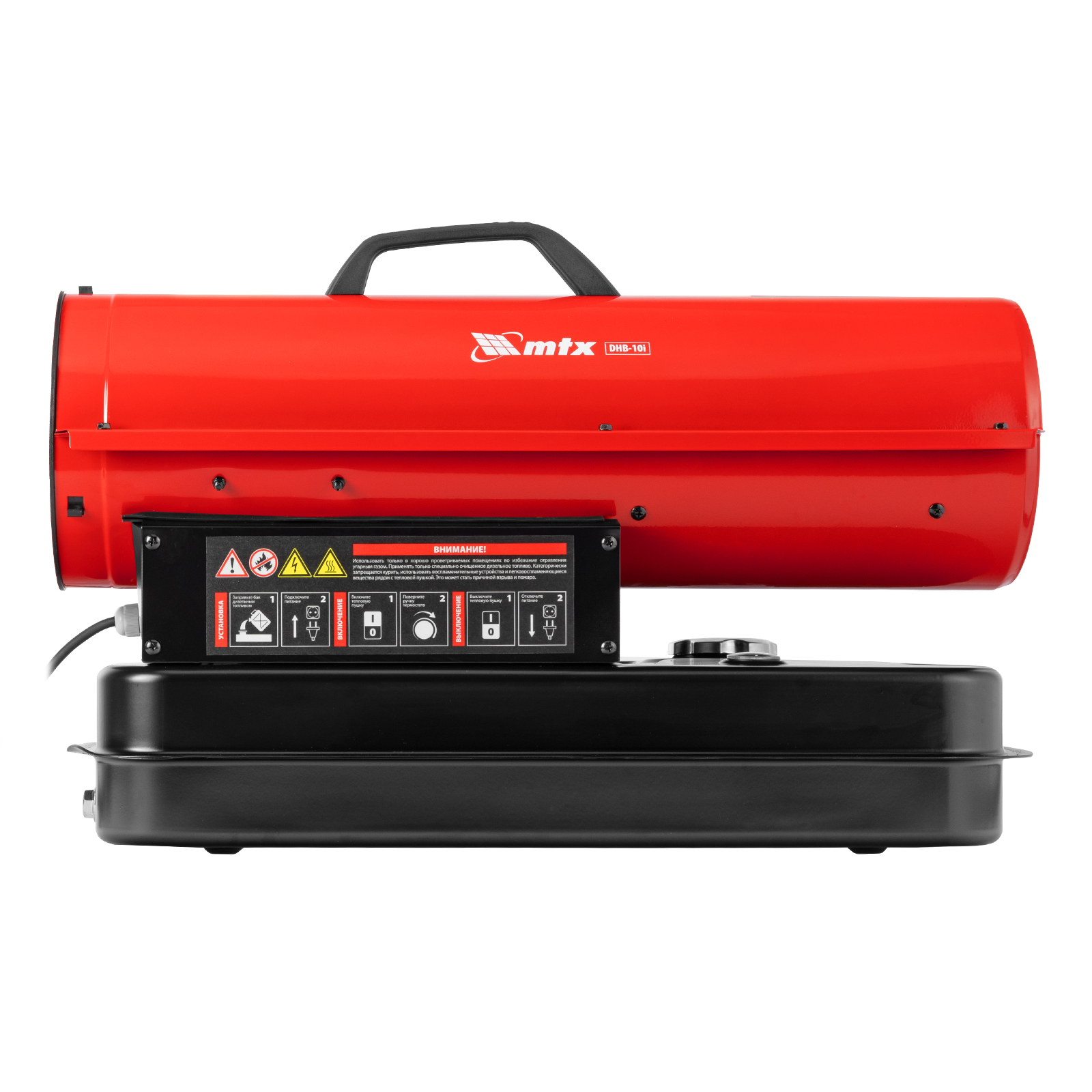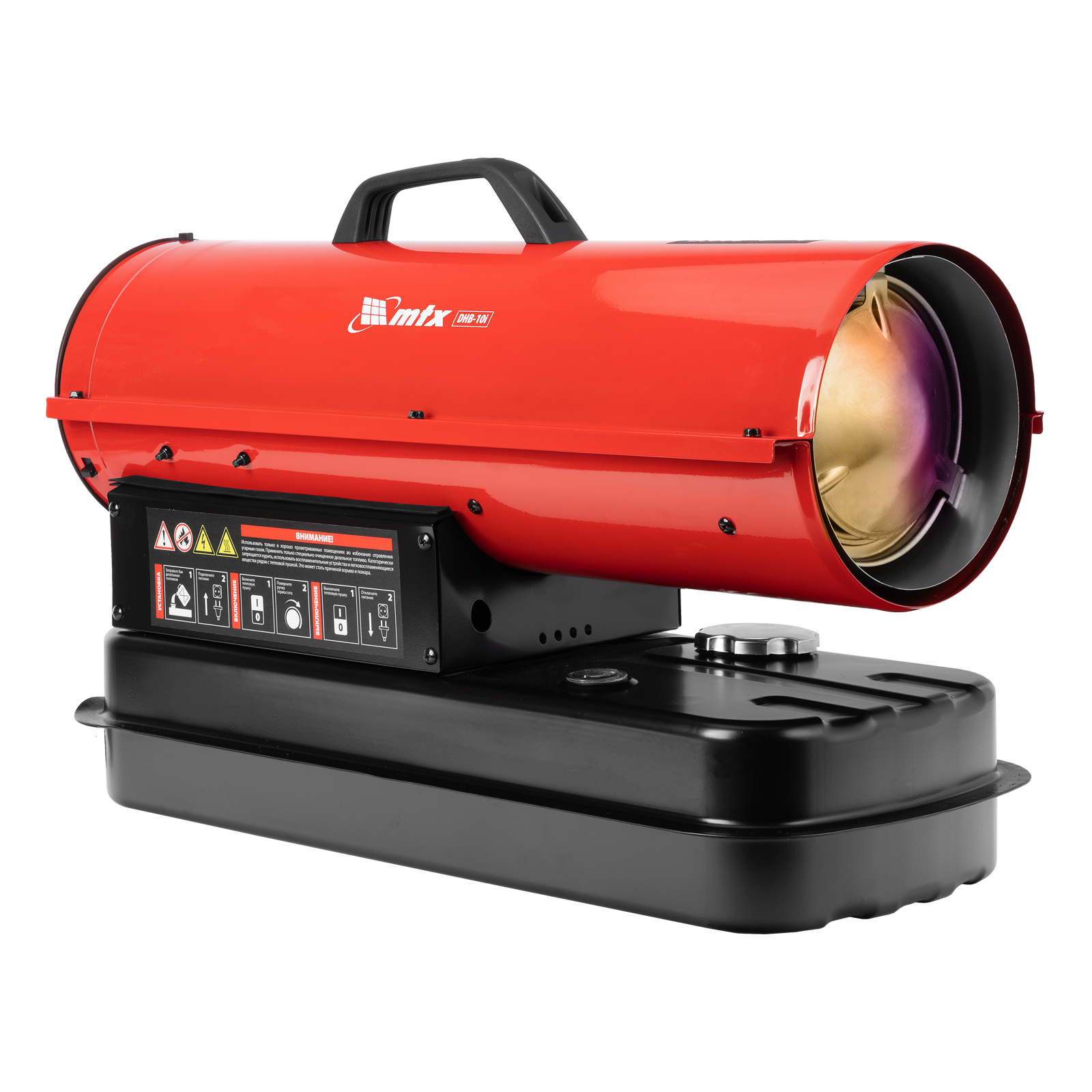 Дизельная тепловая пушка MTX DHB-10i 98904 тепловой мощностью 10 кВт и производительностью 400 м3/ч, с прямым типом нагрева и термостатом, предназначена для обогрева складов, цехов, теплиц и других нежилых помещений. Также используется на производстве и в строительстве: для прогрева бетона, просушки стен и разморозки траншей.
