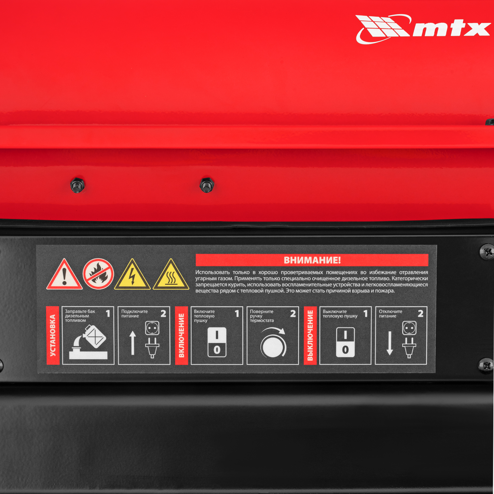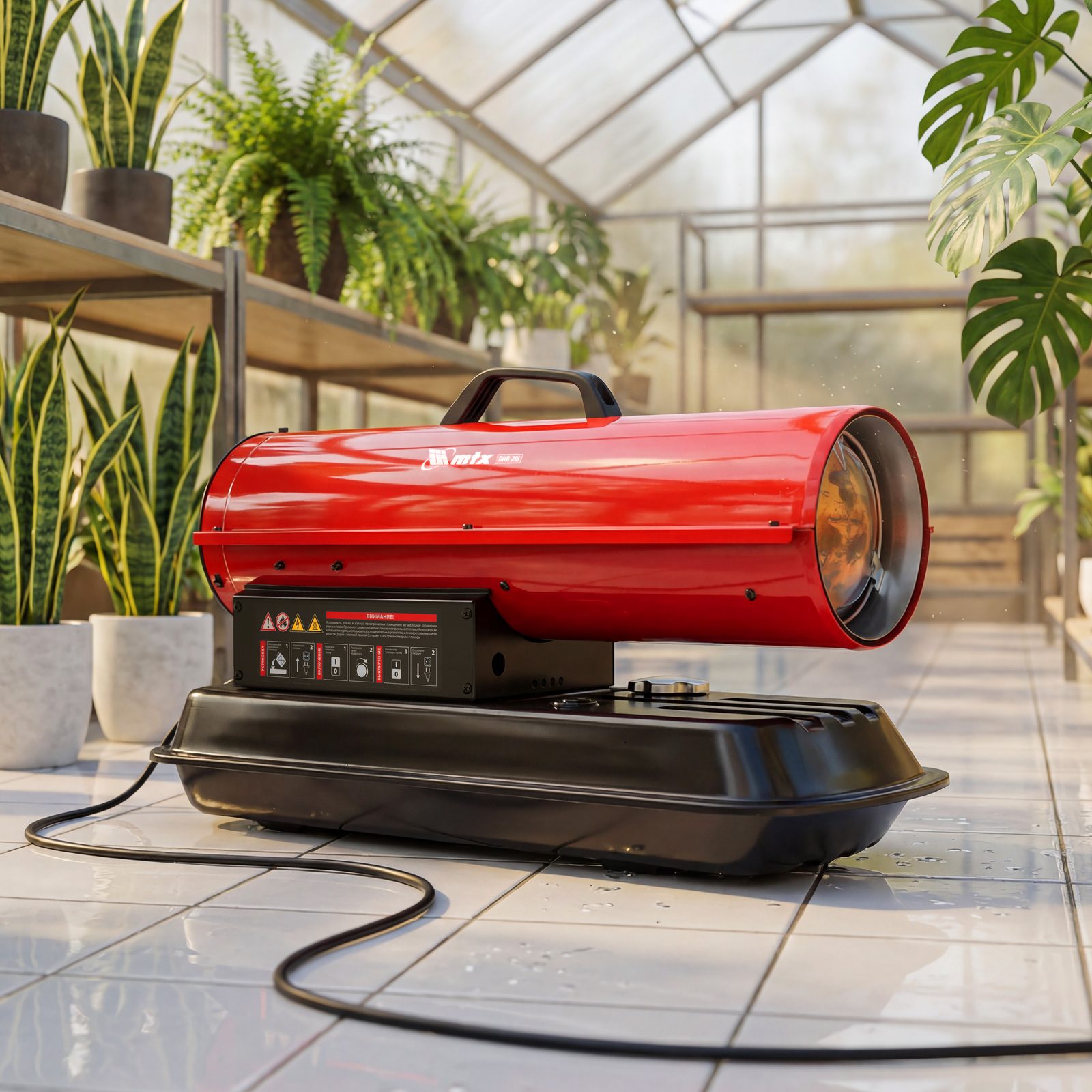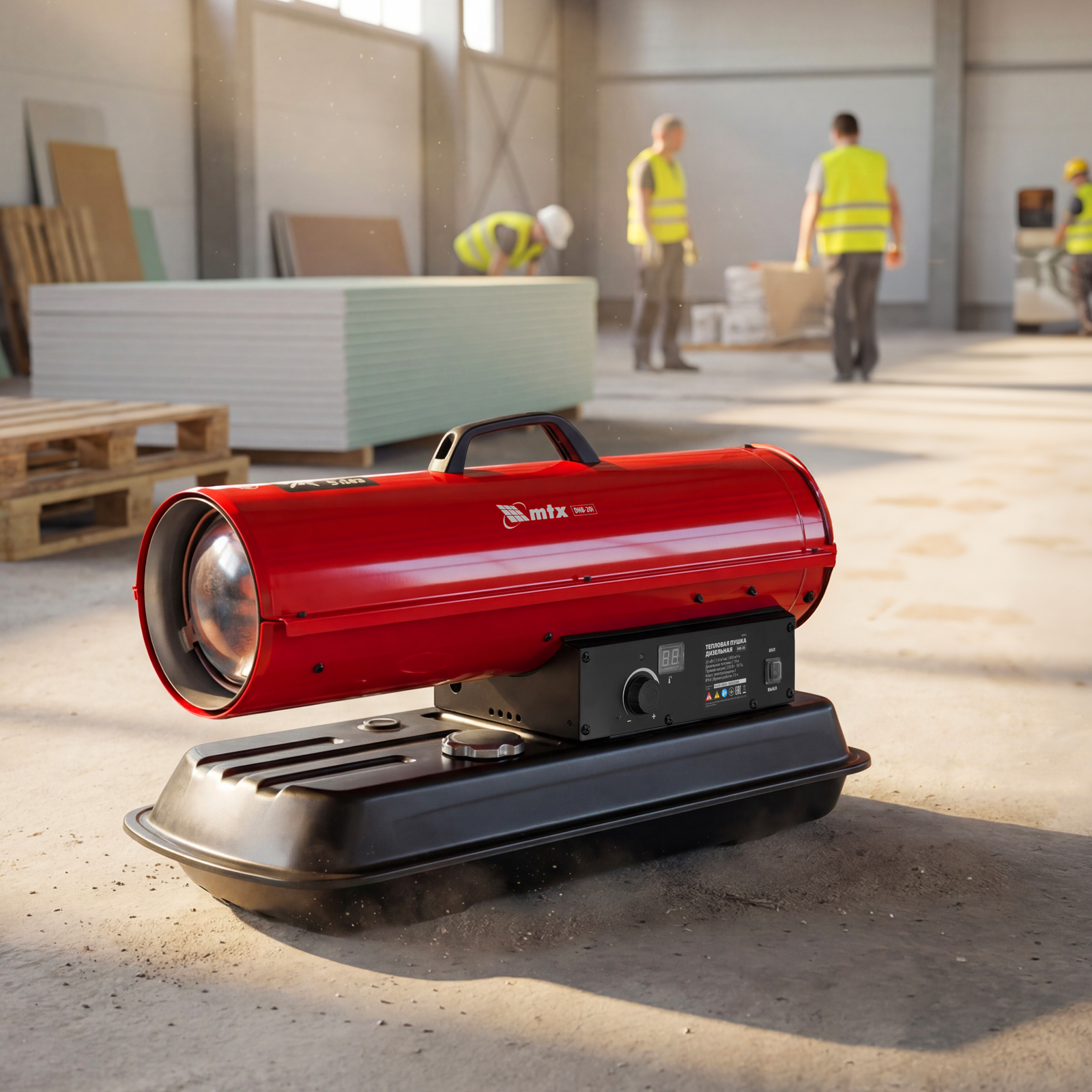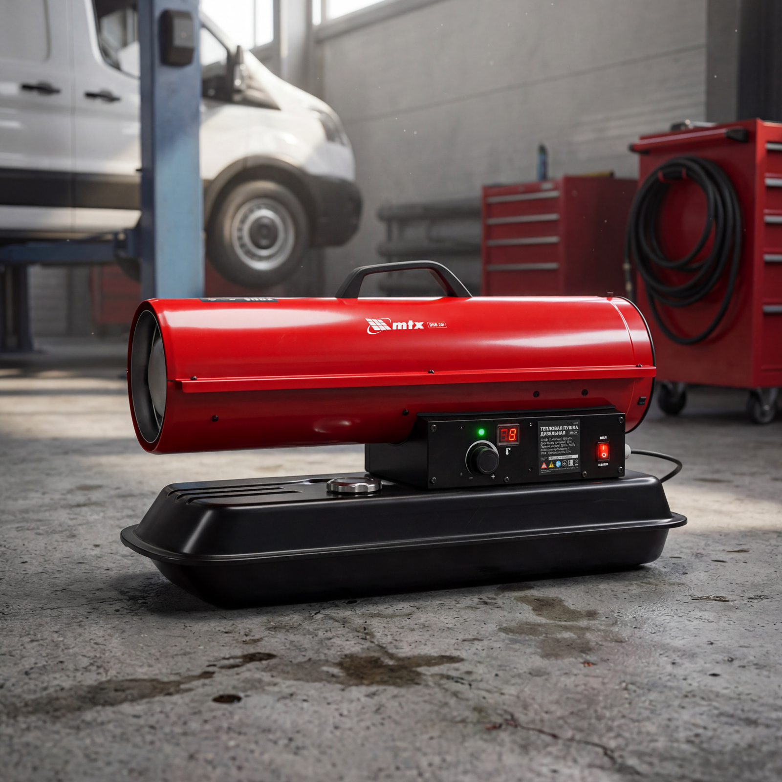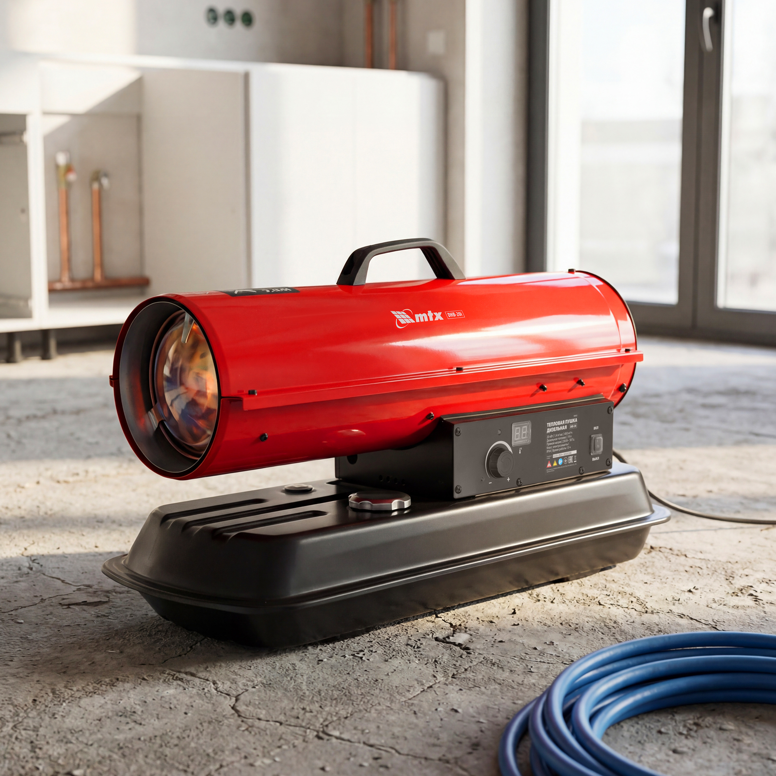 Дизельная тепловая пушка MTX DHB-20i 98905 номинальной тепловой мощностью 20 кВт и производительностью 450 м3/ч, с прямым типом нагрева и термостатом, предназначена для обогрева складов, цехов, теплиц и других нежилых помещений. Также используется на производстве и в строительстве: для прогрева бетона, просушки стен и разморозки траншей.