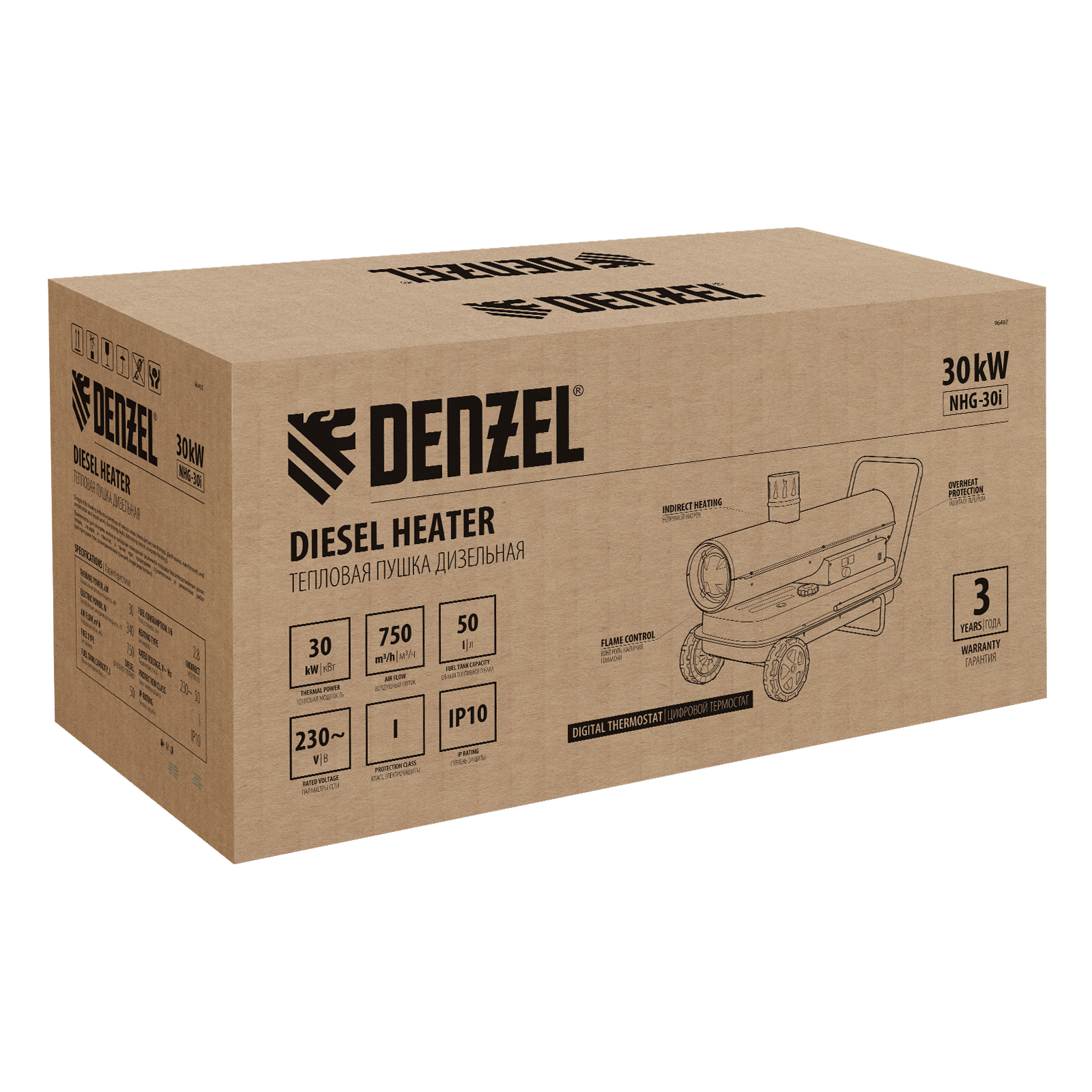 Дизельная тепловая пушка непрямого нагрева DENZEL NHG-30i 96492 с цифровым термостатом обладает тепловой мощностью 30 кВт и генерирует поток теплого воздуха 750 м3/ч. Предназначена для обогрева шатров, палаток, складов, а также технических помещений, ангаров, теплиц и строительных объектов. В работе пушки используется схема непрямого нагрева: при помощи отводного патрубка продукты горения можно полностью вывести за пределы помещения. Такое решение позволяет использовать устройство в присутствии людей.