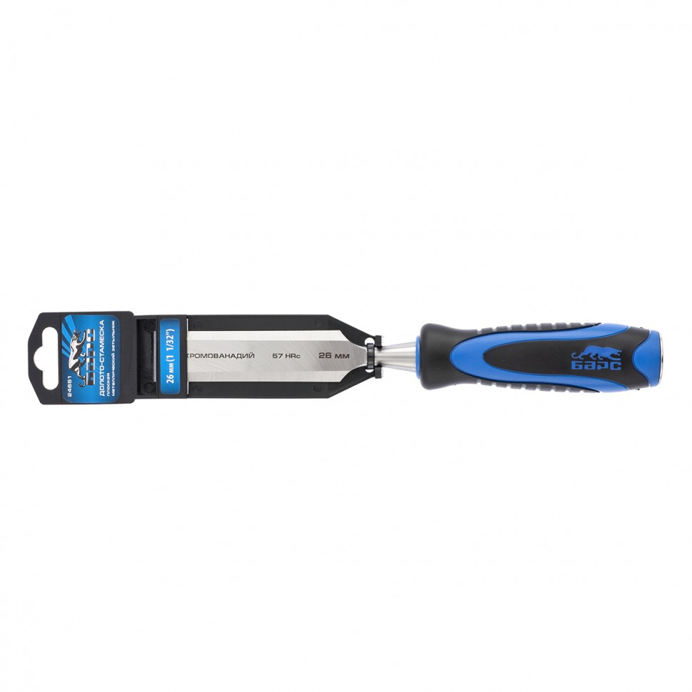 Плоское долото-стамеска Барс 24651 с шириной режущей части 26 мм, с двухкомпонентной рукояткой и металлическим затыльником, предназначено для выборки прямоугольных пазов, снятия фасок, обработки шиповых соединений и выполнения других столярно-плотницких работ. Используется для работы с массивом дерева любой твердости. По затыльнику рукоятки можно наносить удары киянкой или небольшим молотком, поэтому инструмент легко погружается в древесину и обеспечивает аккуратный ровный контур среза.