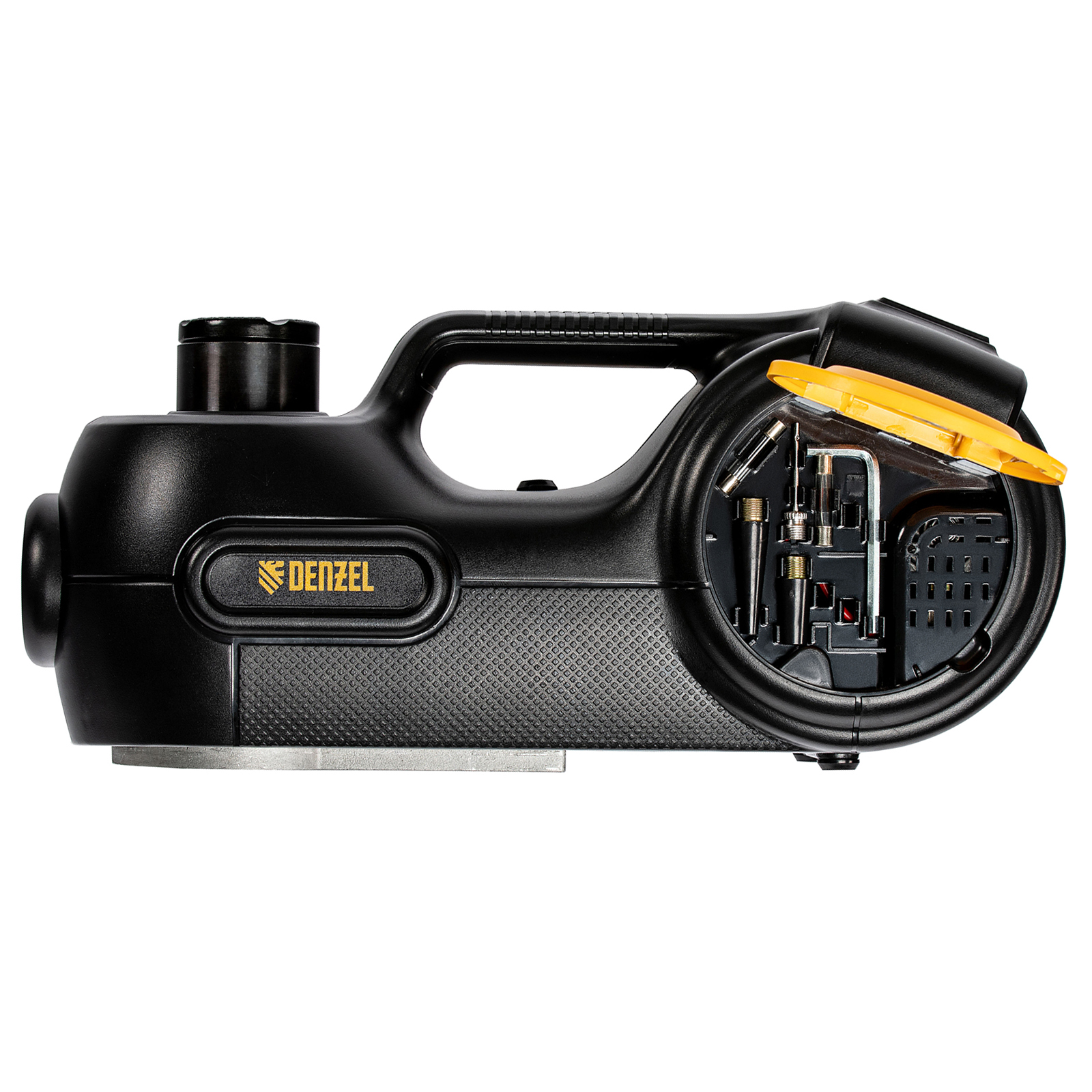 - Продуманная конструкция — в корпусе домкрата имеются отсеки для хранения аксессуаров, а также шланга и кабеля питания.