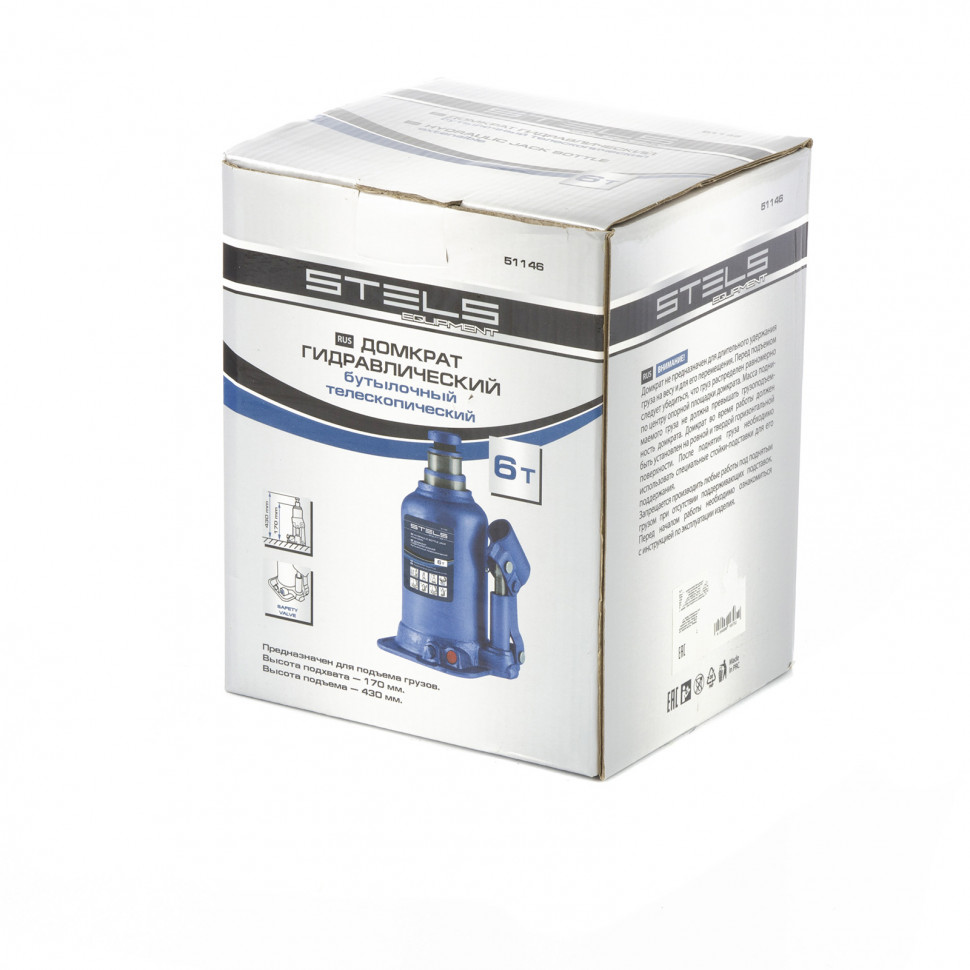 Гидравлический бутылочный телескопический домкрат Stels 51146 используется для поднятия грузов весом до 6 т с на высоту 170-430 мм. Не требует больших усилий и оптимален для автомобилей с большим клиренсом. Домкрат можно использовать в гараже для самостоятельного ремонта машины или в автосервисе для решения профессиональных задач.