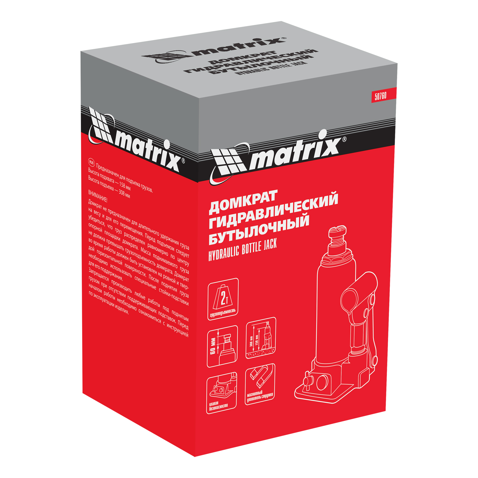 Гидравлический бутылочный домкрат Matrix 50760 предназначен для быстрого поднятия грузов массой до 2 т на высоту 158-308 мм. Будет полезен автолюбителям и мастерам СТО в качестве полупрофессионального инструмента. Встроенный магнитный уловитель металлической стружки защищает резиновые уплотнители от повреждений.