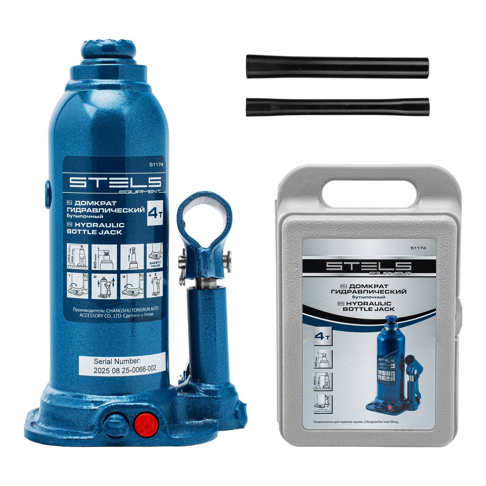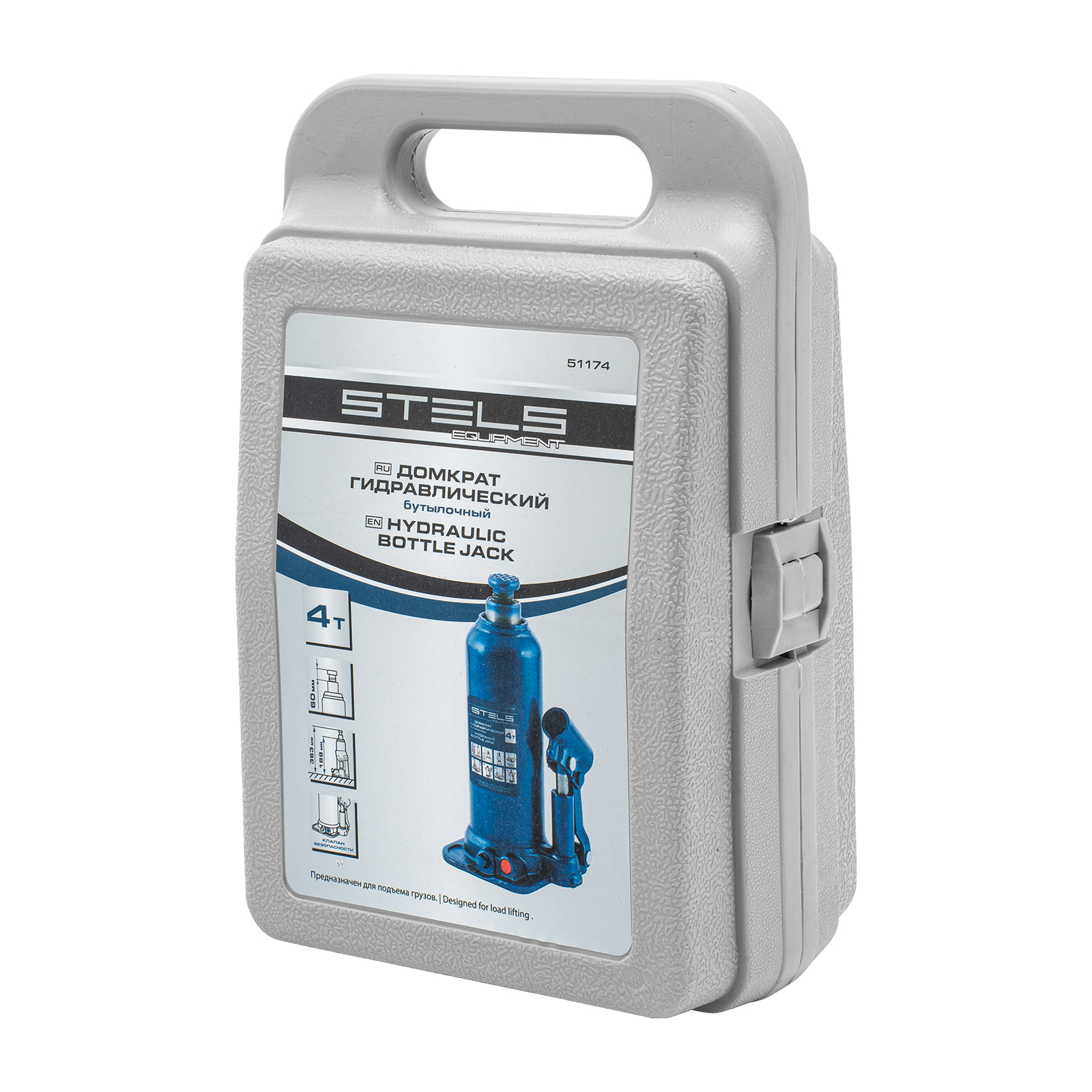 Гидравлический бутылочный домкрат Stels 51174 в пластиковом кейсе предназначен для поднятия грузов весом до 4 т на высоту 188-363 мм. Он не занимает много места и легко помещается в багажник, поэтому его можно брать с собой в дорогу или хранить в гараже. Используется для самостоятельного ремонта авто, также подходит для профессионального применения на станциях технического обслуживания.