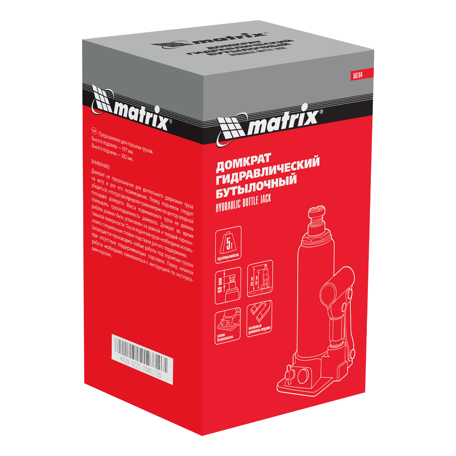 Гидравлический бутылочный домкрат Matrix 50764 предназначен для быстрого поднятия грузов массой до 5 т на высоту 197-382 мм. Будет полезен автолюбителям и мастерам СТО в качестве полупрофессионального инструмента. Встроенный магнитный уловитель металлической стружки защищает резиновые уплотнители от повреждений.