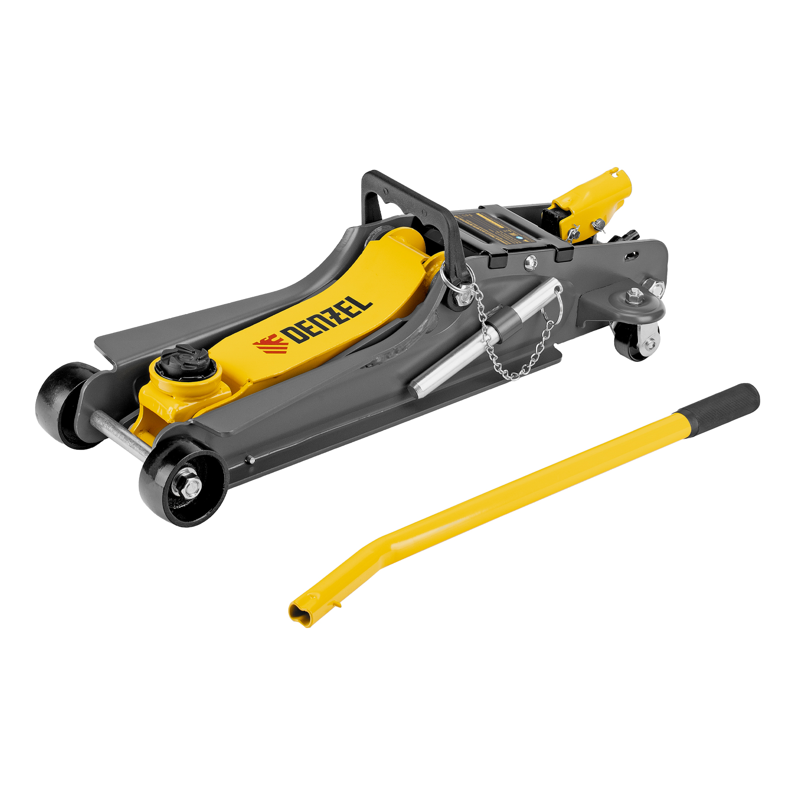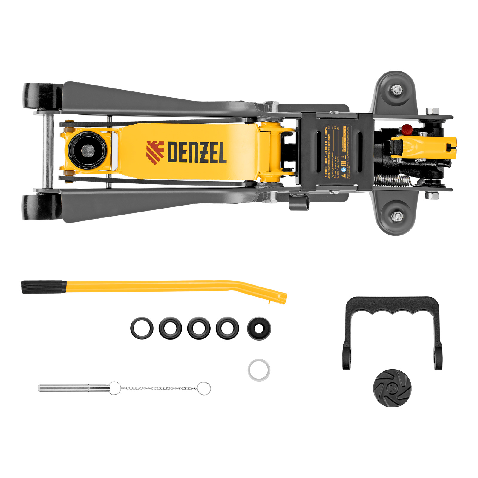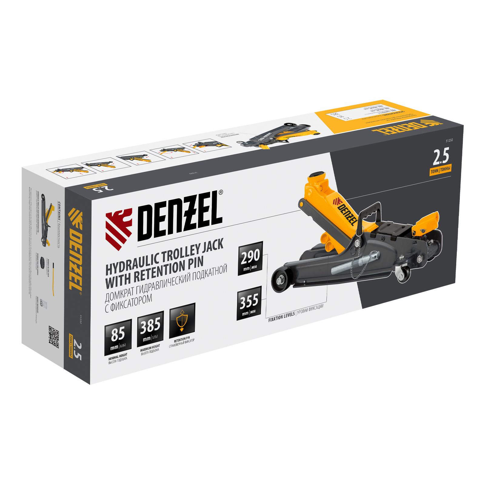 Гидравлический подкатной домкрат Denzel 51232 с фиксатором имеет высоту подхвата 85 мм и предназначен для плавного подъема грузов массой до 2,5 т на высоту до 385 мм. Страховочный штифт позволяет фиксировать подъемный рычаг на высоте 290 и 355 мм для безопасной работы. Домкрат пригодится владельцам легковых автомобилей с низким и стандартным клиренсом.
