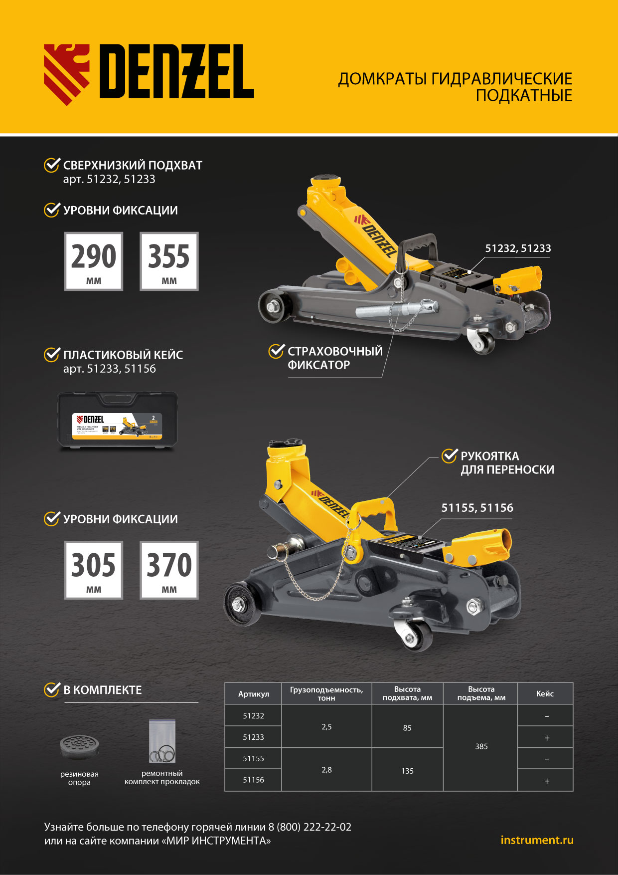 - Удобное хранение и транспортировка — домкрат поставляется в прочном пластиковом кейсе.