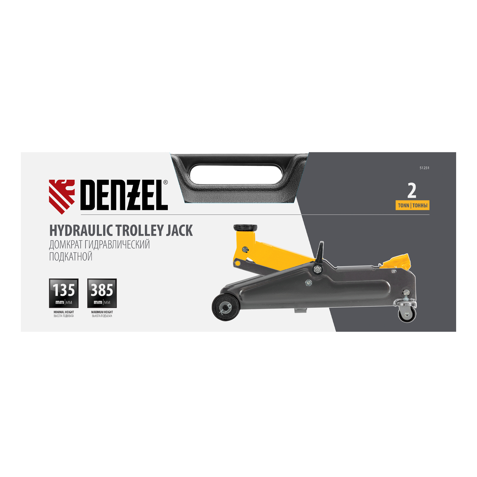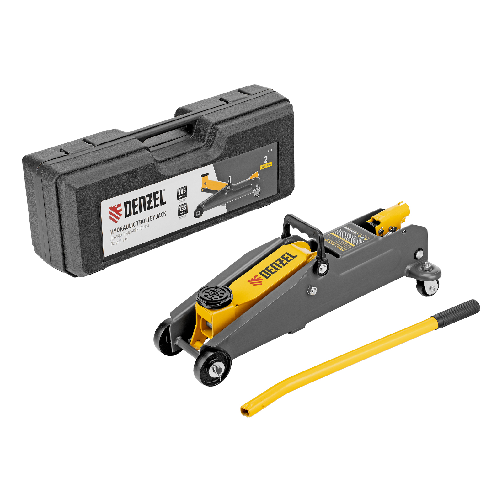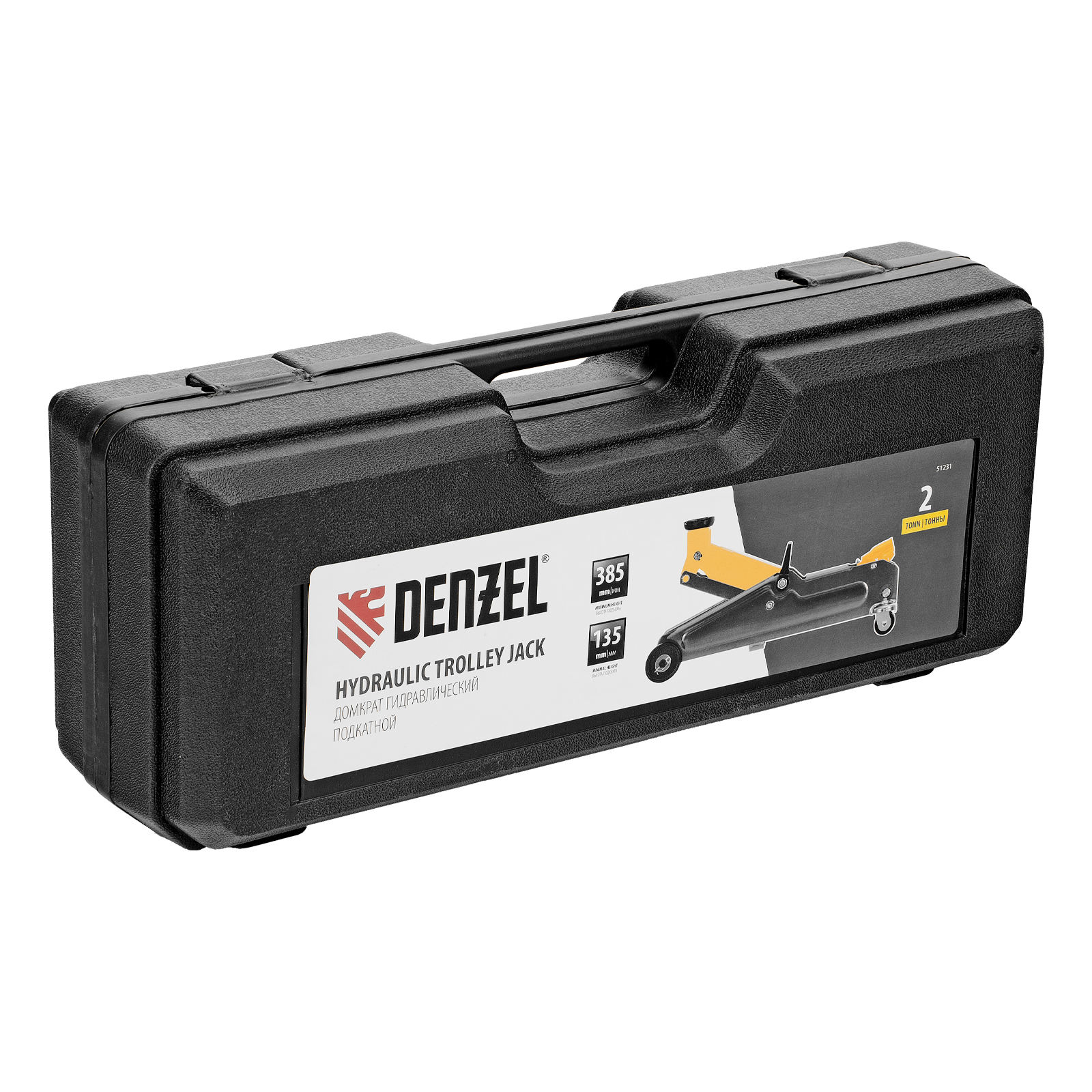 Гидравлический подкатной домкрат Denzel 51231 с высотой подхвата 135 мм, поставляющийся в пластиковом кейсе, предназначен для плавного подъема грузов массой до 2 т на высоту до 385 мм. Домкрат пригодится владельцам легковых автомобилей со стандартным клиренсом.