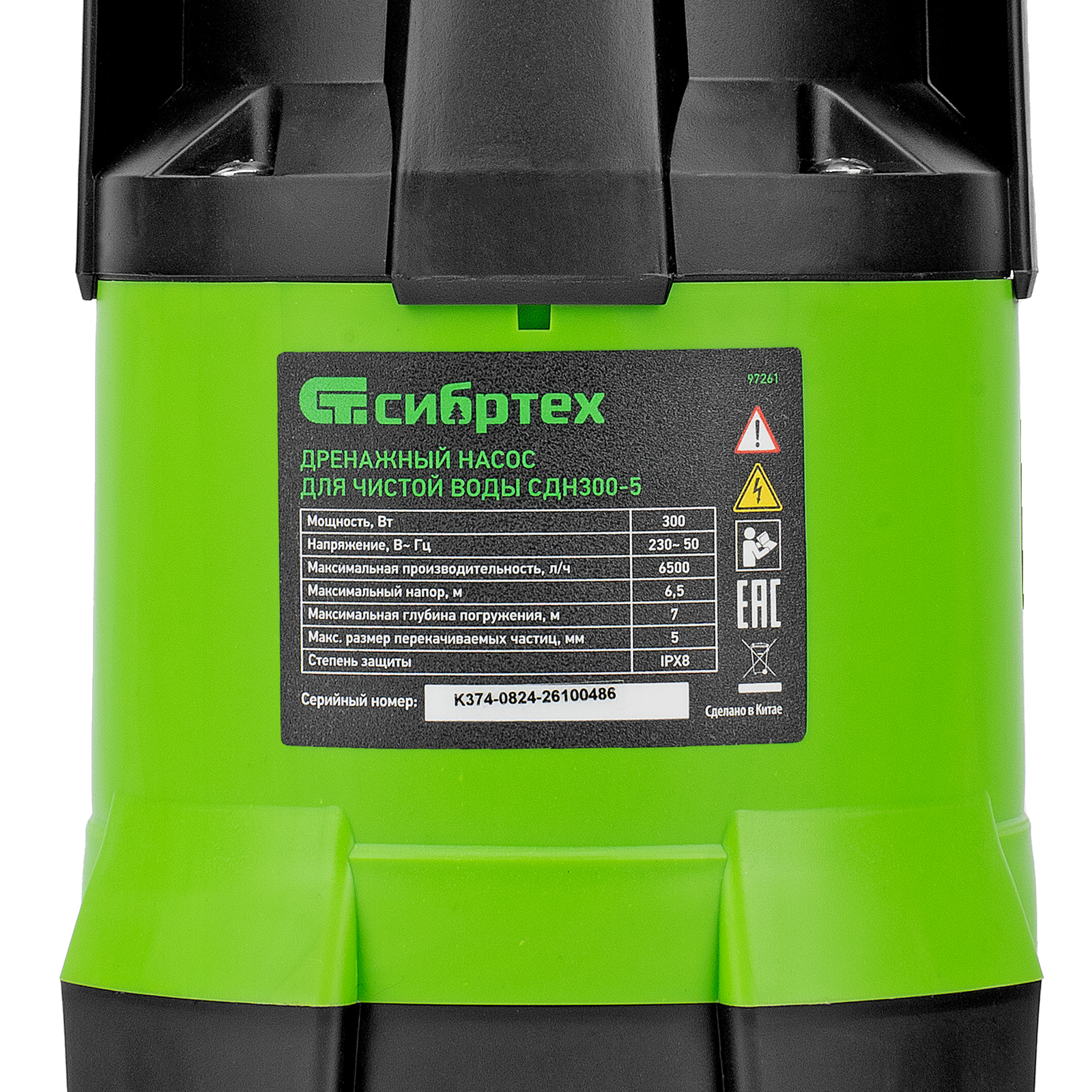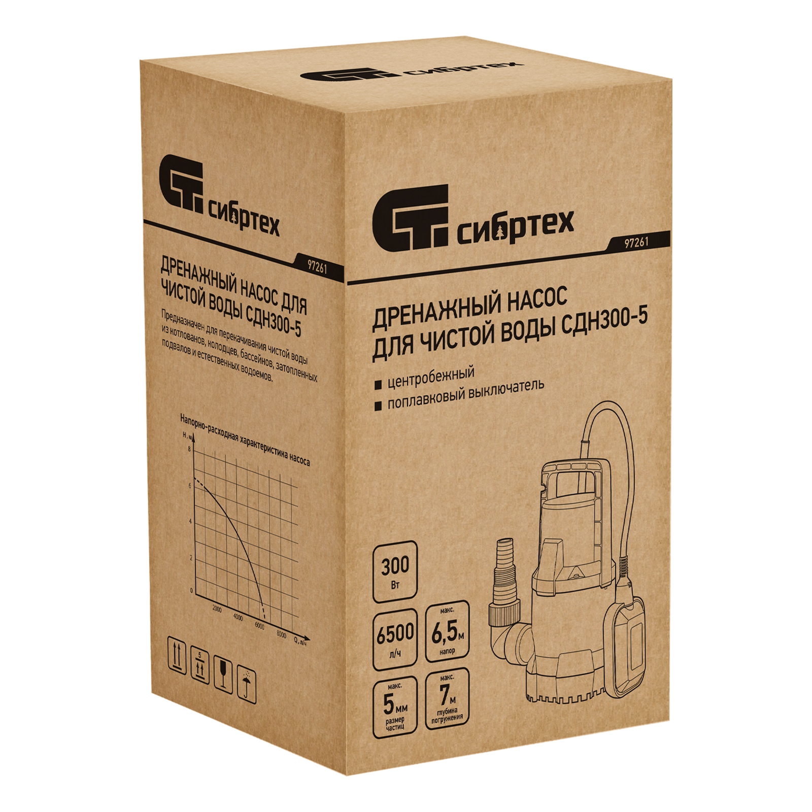 Дренажный насос для чистой воды СДН300-5, 300 Вт, напор 6.5м, 6500 л/ч Сибртех в Уфе