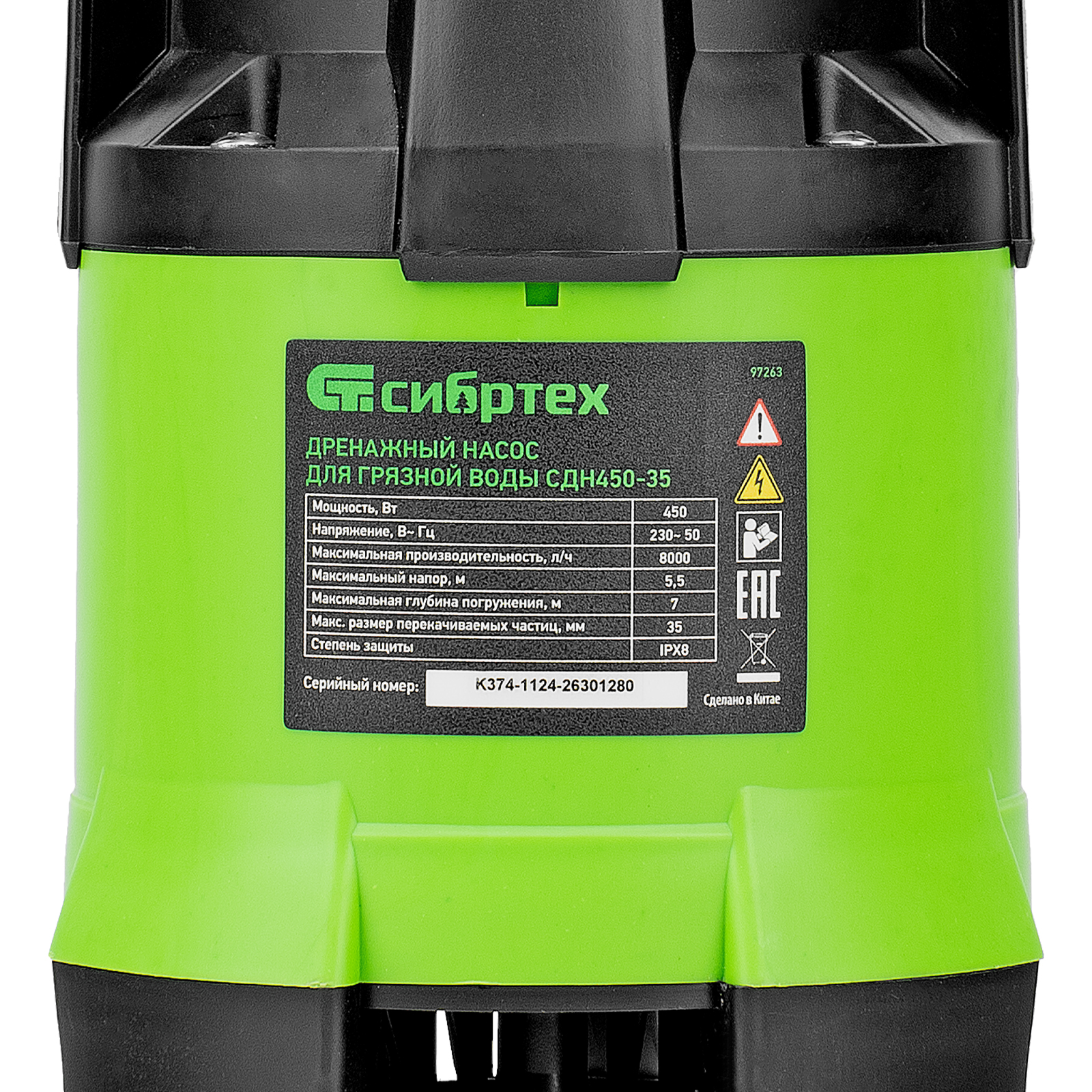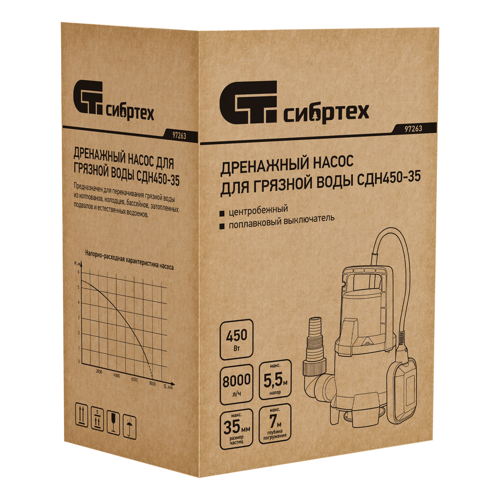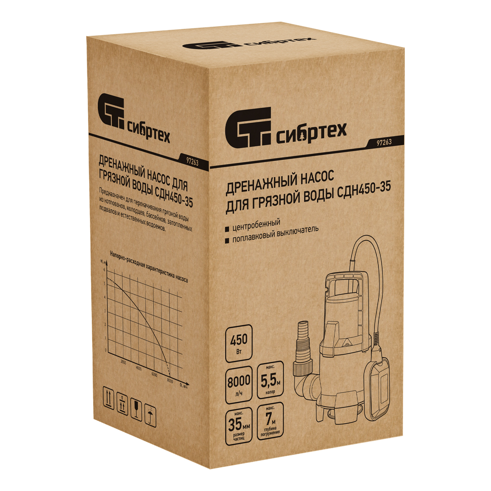 Дренажный насос для грязной воды СДН450-35, 450 Вт, напор 5.5 м, 8000 л/ч Сибртех в Уфе