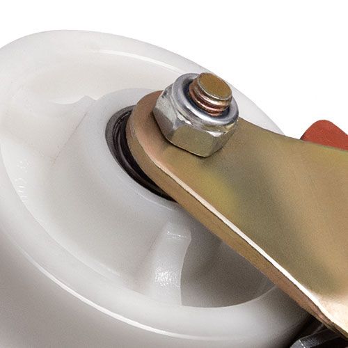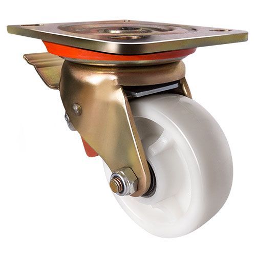 Данное большегрузное нейлоновое колесо предназначено для установки на передвижное оборудование, используемое в пищевой, химической и фармацевтической промышленности. Оно не боится воздействия влаги и различных химически агрессивных веществ, отличается низким коэффициентом трения и высокой износостойкостью. Шариковый подшипник в оси обеспечивает плавное вращение. Поворотный кронштейн изготовлен из оцинкованной стали, тип крепления — платформа с отверстиями под болты. Наличие тормозного механизма позволяет при необходимости надежно блокировать колесо, предотвращая его самопроизвольное перемещение. Максимальная грузоподъемность модели — 350 кг.