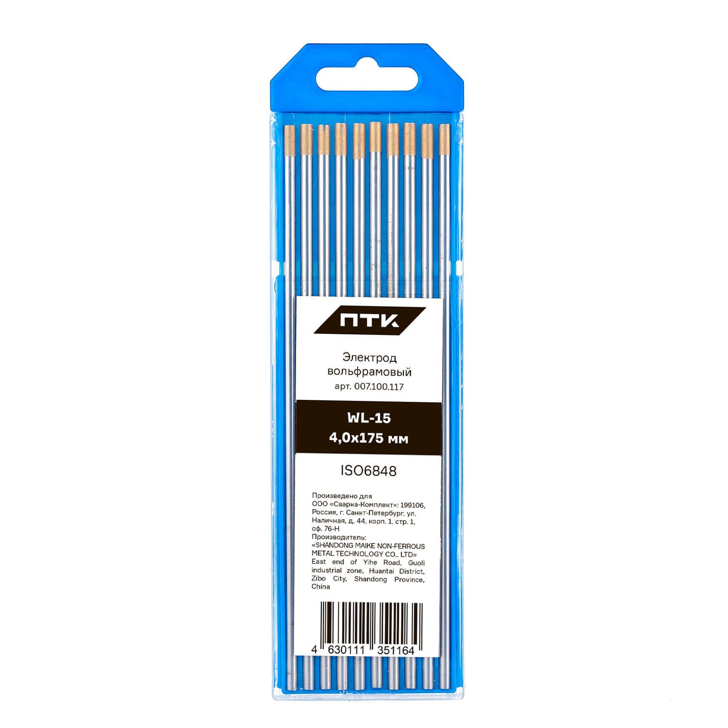 Диаметр электрода 4,0 мм, длина электрода 175 мм. Вольфрам имеет отличительное цветовое обозначение – золотой торец.