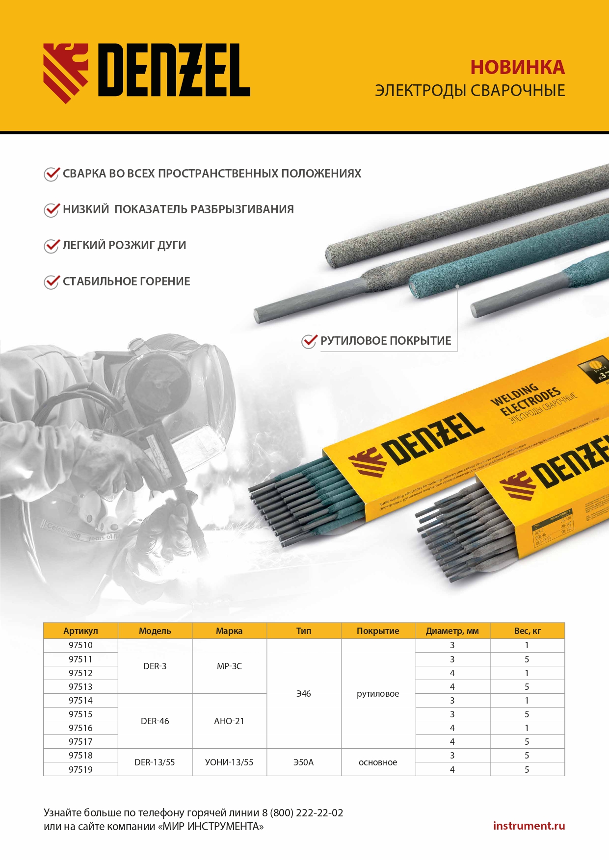 Электроды DER-3, диам. 4 мм, 1 кг, рутиловое покрытие Denzel в Уфе