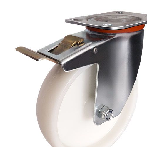Колесная опора EMES EM01 ZKZ 100 F устанавливается на платформенные тележки для пищевой промышленности, передвижное медицинское оборудование и технику. Нейлоновый обод хорошо распределяет нагрузку. Поворотный кронштейн с тормозом изготовлен из оцинкованной стали. Максимальная грузоподъемность модели составляет 140 кг. Рабочий температурный диапазон — от -20 до +70 °С.