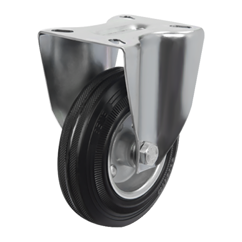 Грузоподъемность неповоротного промышленного колеса EM02SPR125 составляет 110 кг, диаметр — 125 мм. Контактный слой изготовлен из литой черной резины, обод и кронштейн — из оцинкованной стали. Роликовый подшипник в оси обладает высокой стойкостью к радиальным нагрузкам. Модель подходит для установки на различное складское и строительное оборудование, контейнеры ТБО, может использоваться на поверхностях с уклонами и неровностями, во влажной среде.
