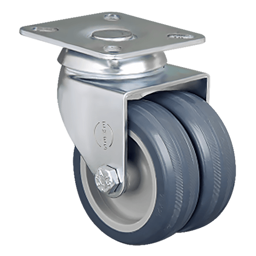 Данная сдвоенная аппаратная колесная опора предназначена для установки на торговое оборудование, больничную мебель, медицинскую аппаратуру и т. п. Контактный слой выполнен из серой резины, кронштейн — из оцинкованной стали. Модель имеет диаметр 75 мм, работает в температурном диапазоне от -20 до +60 °С. Грузоподъемность составляет 80 кг.