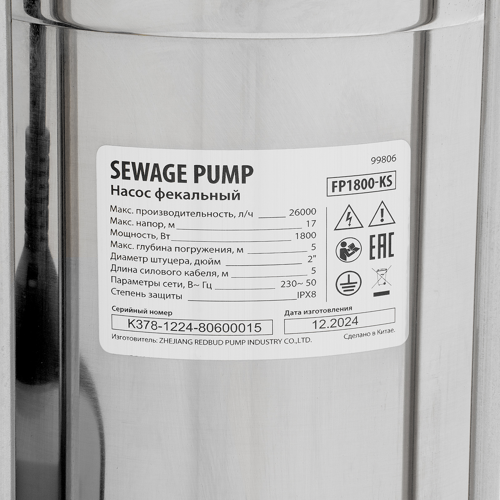 Фекальный насос FP1800-KS, 1800 Вт, напор 17 м, 26000 л/ч, нож-измельчитель Denzel в Уфе