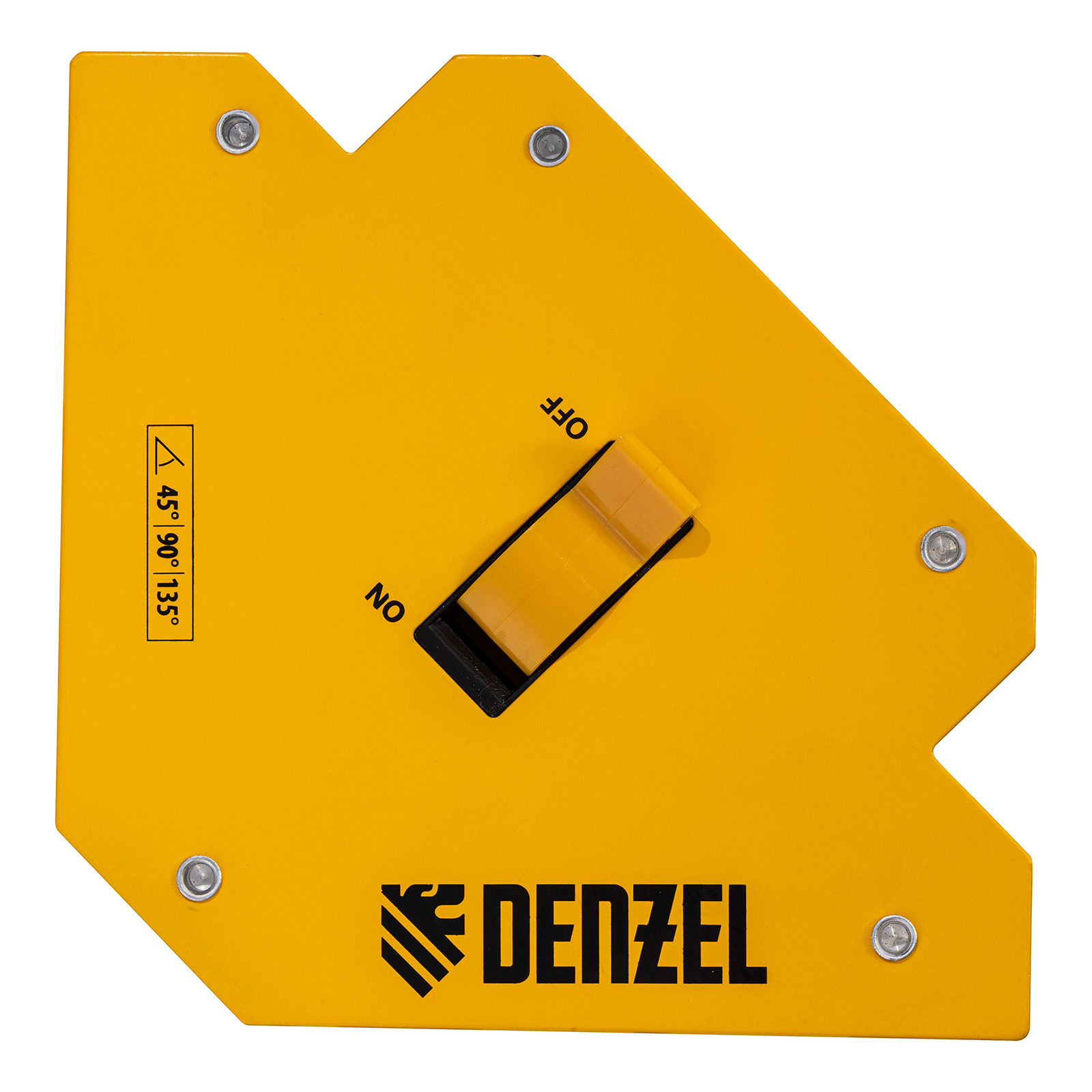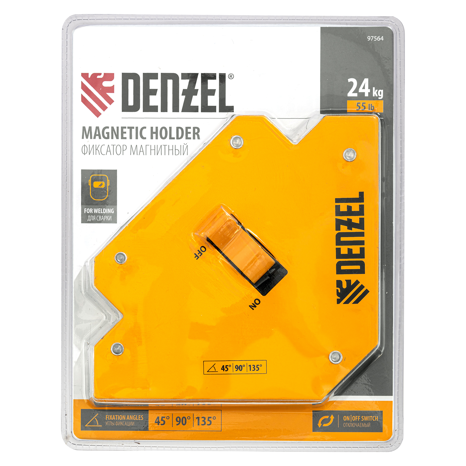 Фиксатор магнитный отключаемый для сварочных работ Denzel 97564 выдерживает усилие 55 LB (25 кг) и способен удерживать металлические предметы под углом 45°, 90°, 135°. Применяется при пайке, сварке, монтаже уголков, труб, профилей и других конструкций. Магнитное поле при необходимости отключается, что упрощает установку фиксатора и его снятие.