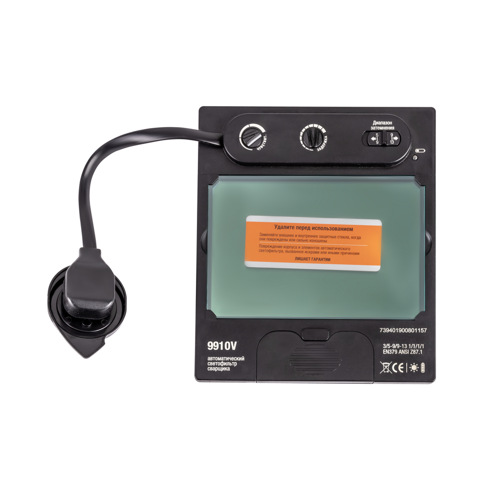 Фильтр-хамелеон 9910V GEFEST с внешней регулировкой затемнения и высшим оптическим классом отличается увеличенным смотровым окном, что обеспечивает максимум комфорта при работе, позволяя видеть не только область сварки, но и окружающее пространство. Данная модель светофильтра также оборудована 4мя независимыми датчиками с большим углом действия и двумя диапазонами затемнения. Режим шлифовки позволяет блокировать затемнение светофильтра при использовании маски в качестве защитного щитка при работе с УШМ или шлифовальным инструментом.2 ДИАПАЗОНА ЗАТЕМНЕНИЯ: Светофильтр имеет 2 диапазона степени затемнения: 5 – 9 DIN и 9 - 13 DIN. Первый диапазон больше подходит для плазменной резки, лазерной сварки, ручной, полуавтоматической и аргонодуговой сварки на малых токах. Диапазон 9 – 13 DIN подойдёт для сварки MMA, MIG/MAG, TIG при сварочном токе 125 А и выше.УВЕЛИЧЕННЫЙ РАЗМЕР СМОТРОВОГО ОКНА: Увеличенный размер смотровой области обеспечивает максимум комфорта и безопасности при работе и позволяет хорошо видеть как область сварки, так и окружающее пространство.ВЫСШИЙ ОПТИЧЕСКИЙ КЛАСС: Светофильтр имеет максимальный оптический класс 1/1/1/1 по параметрам оптический класс светофильтра, степень рассеивания света, однородность затемнения, угловая зависимость. Это позволяет использовать маску при любых режимах сварки, в том числе при профессиональной TIG-сварке.РЕГУЛИРОВКА СТЕПЕНИ ЗАТЕМНЕНИЯ: Светофильтр имеет функцию плавной регулировки степени затемнения. В зависимости от типа сварки или резки, величины тока и внешней освещённости, можно точно установить комфортное затемнение для глаз.РЕЖИМ GRIND: Режим шлифовки (Grind) даёт возможность блокировать затемнение светофильтра для использования маски в качестве защитного щитка при работе с УШМ («болгаркой») или шлифовальным инструментом.ПРЕИМУЩЕСТВА:2 диапазона затемненияВнешняя регулировка степени затемненияВнутренняя регулировка чувствительностиВнутренняя регулировка задержки открытияУвеличенный размер смотровой областиРежим шлифовки4 независимых датчика с большим углом действияМаксимальная постоянная защита от невидимого УФ/ИК до DIN 16Светофильтр соответствует современным стандартам качества EN379 и ANSI Z 87.1ФУНКЦИОНАЛЬНЫЕ ОСОБЕННОСТИ:4 ОПТИЧЕСКИХ ДАТЧИКА: Независимые фотодатчики мгновенно срабатывают при появлении сварочной дуги и поддерживают закрытое состояние светофильтра даже тогда, когда один из датчиков перекрыт каким-либо препятствием. Повышенная чувствительность сенсоров даёт исключительную стабильность обнаружения дуги. Светофильтр оснащён четырьмя независимыми датчиками, что гарантирует срабатывание даже в том случае, если три датчика будут закрыты.ЗАЩИТА ОТ УФ/ИК ИЗЛУЧЕНИЯ: Максимальная постоянная защита от невидимого УФ/ИК излучения дуги гарантирует защиту органов зрения даже при вышедшей из строя управляющей электроники или разряженных элементов питания за счёт зеркального защитного слоя. 2 независимых фотодатчика мгновенно срабатывают при возникновении сварочной дуги и поддерживают закрытое состояние, даже если один из датчиков перекрывается каким-либо препятствием. Повышенная чувствительность сенсоров дает исключительную стабильность обнаружения дуги.