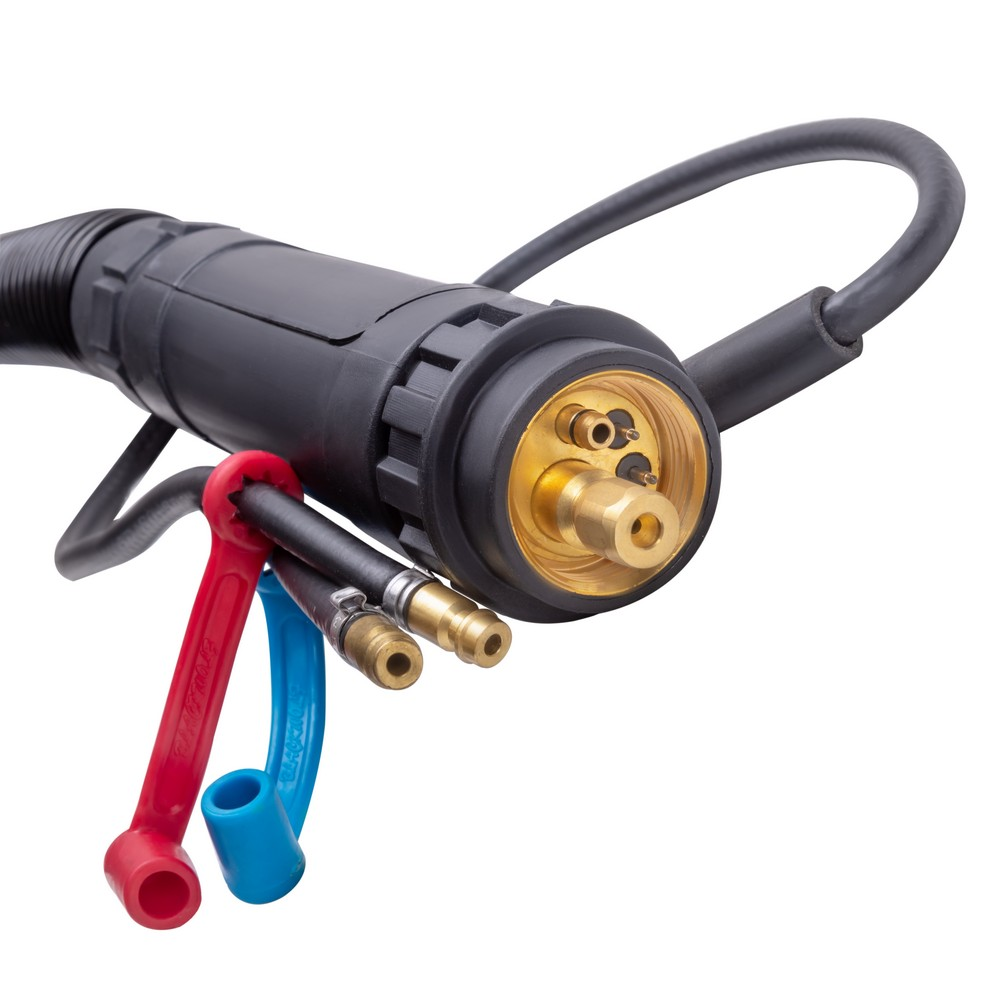 Сварочная горелка с жидкостным охлаждением UnoMIG-500 4м предназначена для сварки MIG/MAG при подключении к аппаратам полуавтоматической сварки для выполнения различного вида сварочных работ. Удобная рукоятка с кнопкой управления сварочным процессом и эргономичный дизайн горелки обеспечивают максимальный комфорт во время работы. Жидкостная система охлаждения позволяет работать при большом сварочном токе продолжительный период времени.ЖИДКОСТНОЕ ОХЛАЖДЕНИЕ: Горелка с жидкостным охлаждением оснащена специальным каналом, по которому циркулирует охлаждающая жидкость. Благодаря системе жидкостного охлаждения достигается ПВ 100%, что позволяет выполнять длинные швы и работать длительный период времени на большом сварочном токе.ЭРГОНОМИЧНОСТЬ: Эргономичная рукоятка горелки хорошо лежит в руке, а кнопка управления сваркой добавляет функциональности, удобства во время сварочного процесса и простоты обслуживания на месте проведения работ.ПРЕИМУЩЕСТВА:Управление кнопкой на рукояткеКомпозитная рукоятка с нескользящими вставкамиТермостойкий пластик повышенной прочностиКурок улучшенной реактивностиШланг-пакет из резины первичного отливаРасходные материалы повышенной прочностиЖидкостное охлаждениеЕвро разъёмФУНКЦИОНАЛЬНЫЕ ОСОБЕННОСТИ:ЕВРО-РАЗЪЁМ: Стандартный евро-разъём горелки даёт возможность подключения к большинству современных сварочных полуавтоматов.КОМПЛЕКТАЦИЯ: Горелка UnoMIG-500 4м - 1 шт.; Гусак UnoMIG 500 угол изгиба 44°, 185 мм - 1 шт.; Канал направляющий тефлоновый, жёлтый - 1 шт.; Сопло коническое 16 мм (MIG-500) - 1 шт.; Медный наконечник M8 x 30 х 1,0 мм - 1 шт.; Медный наконечник M8 x 30 х 1,2 мм - 1 шт.; Диффузор газовый (MIG-500) - 1 шт.; Держатель наконечника M8 (MIG-500) - 1 шт.*Производитель оставляет за собой право вносить изменения в комплектацию оборудования без предварительного уведомления покупателя.