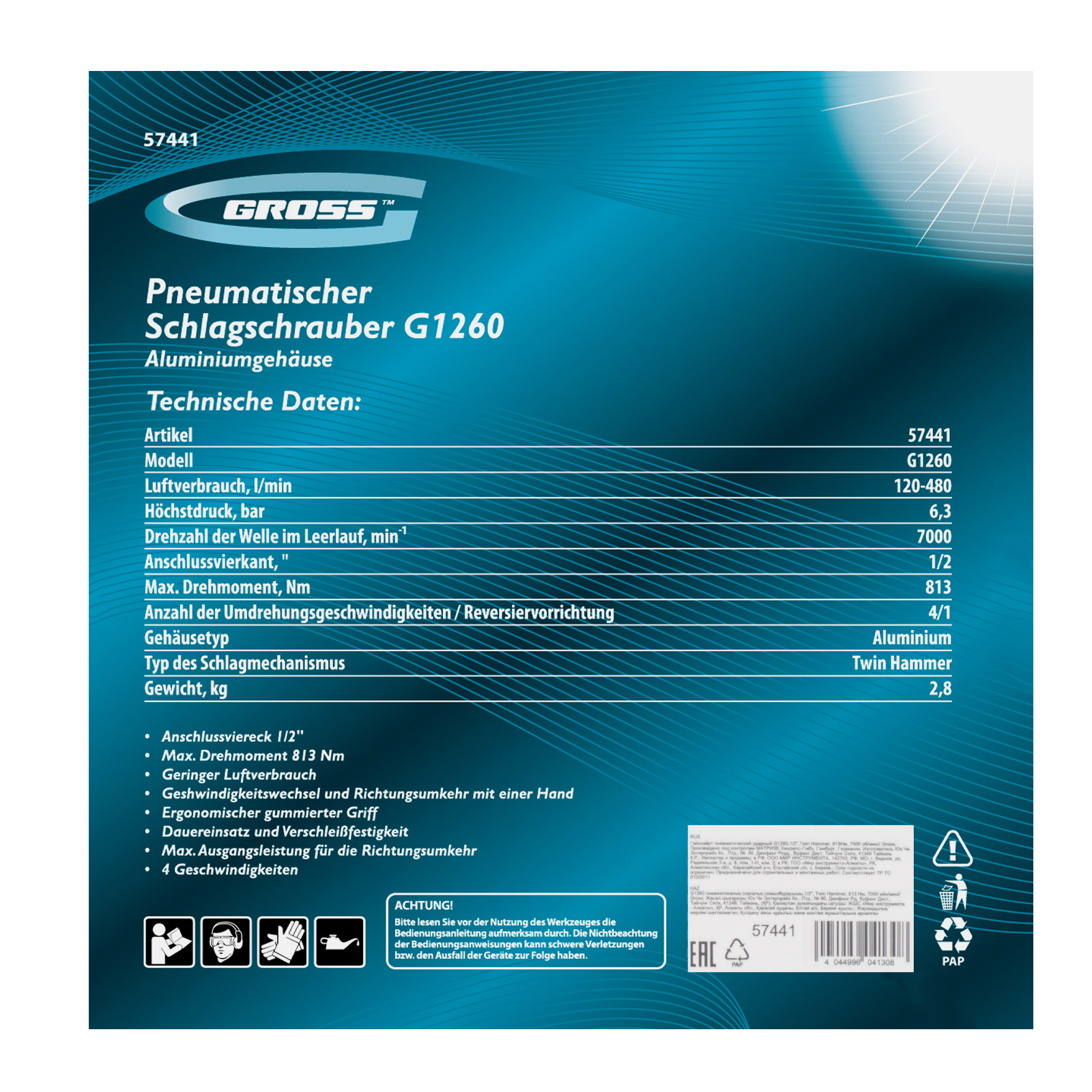 Гайковерт пневматический ударный G1260,1/2, Twin Hammer, 813Нм, 7000 об/мин Gross в Уфе