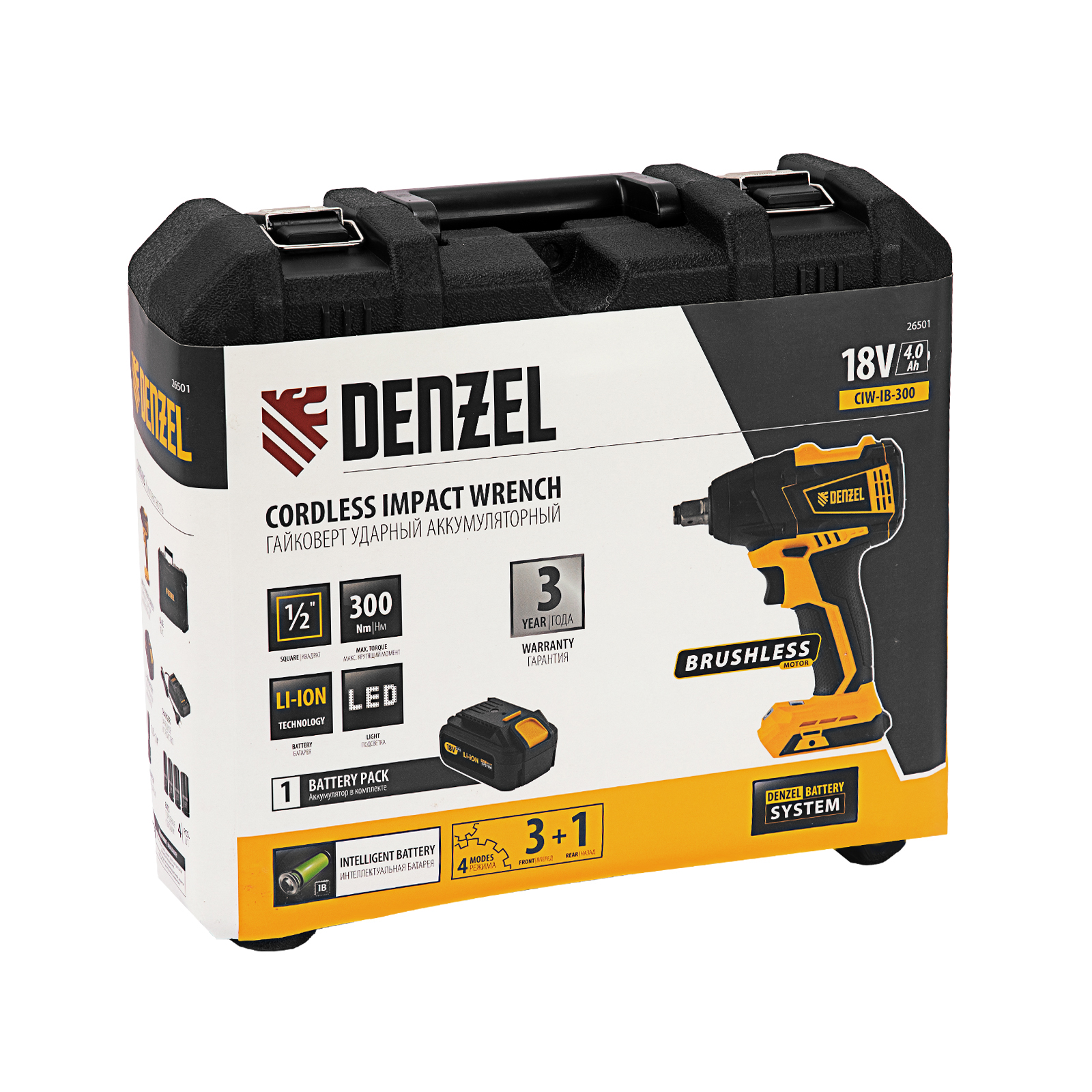 Ударный аккумуляторный гайковерт Denzel CIW-IB-300 с батареей Li-Ion 18 В и бесщеточным двигателем развивает крутящий момент до 300 Нм. Предназначен для монтажа и демонтажа резьбовых соединений, легко справляется с перетянутым и закисшим крепежом.,Надежный литий-ионный аккумулятор без эффекта памяти обеспечивает автономную работу и долгий срок службы инструмента. Гайковерт с присоединительным квадратом 1/2 дюйма будет полезен для сборки и разборки металлических конструкций, а также при техобслуживании автомобилей.