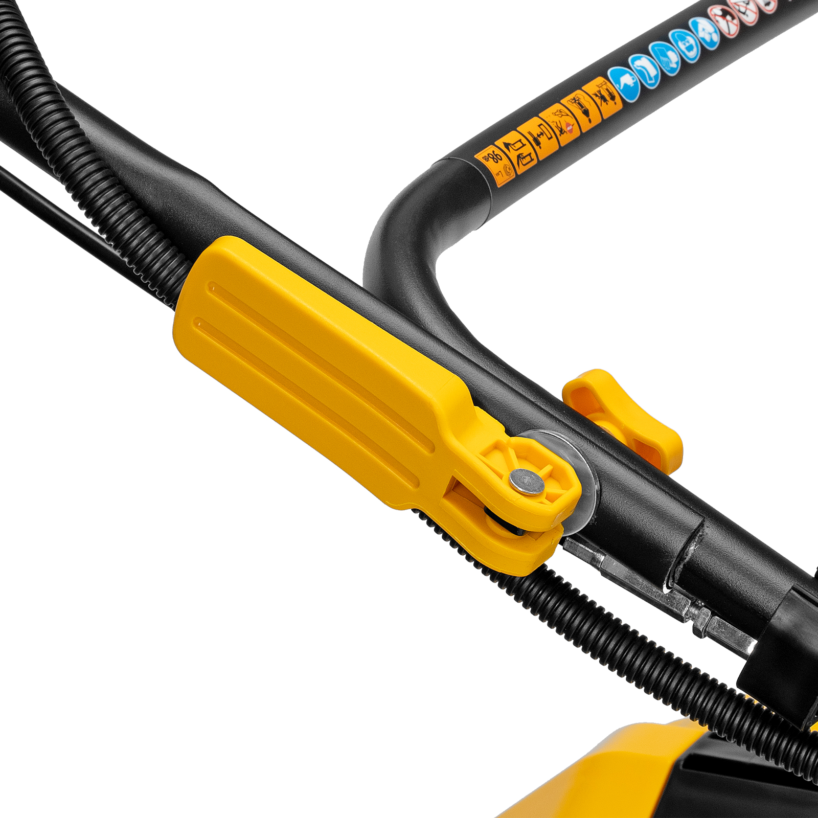 - Регулировка скорости вращения двигателя — запуск и маневрирование происходят на низких оборотах, скашивание — на высоких.