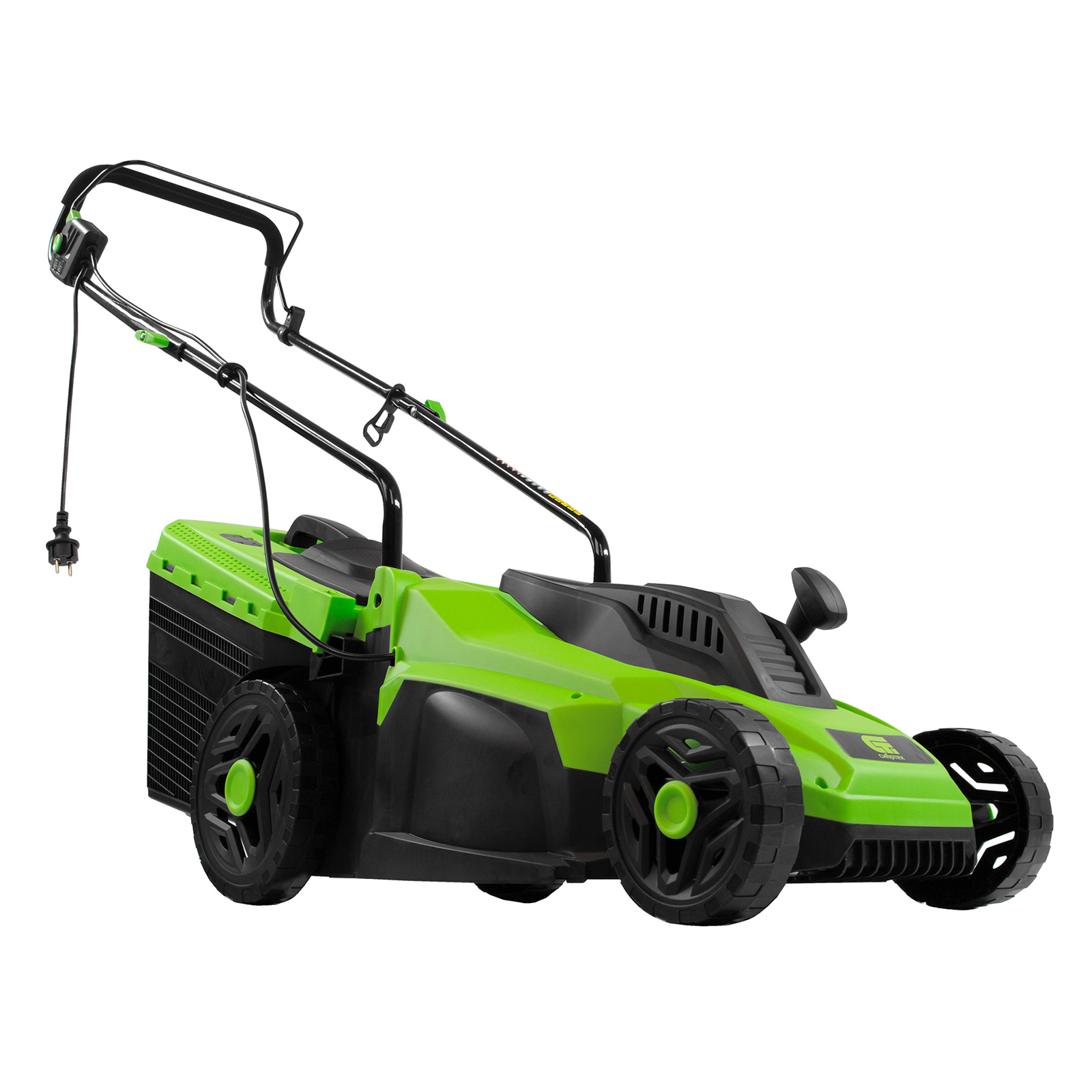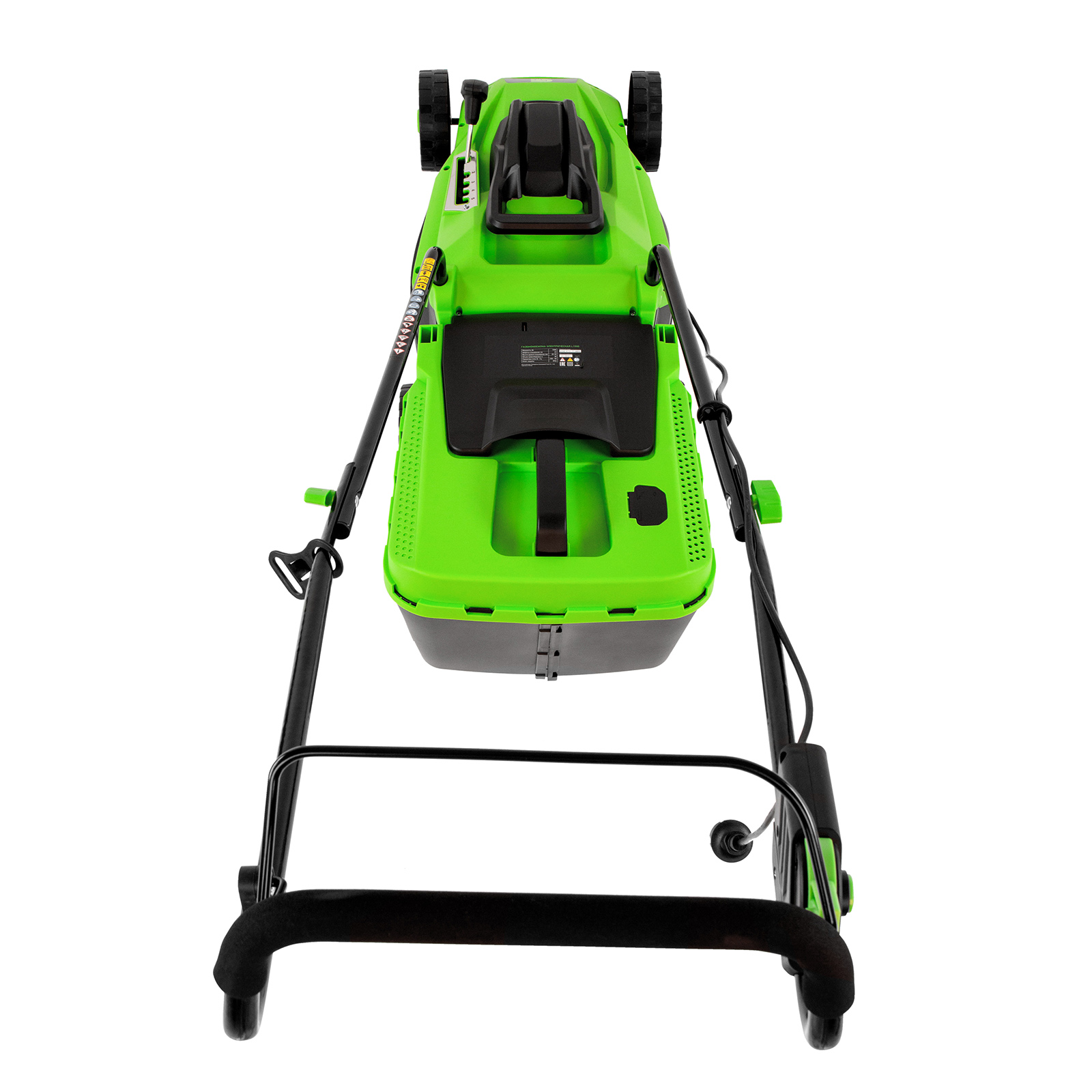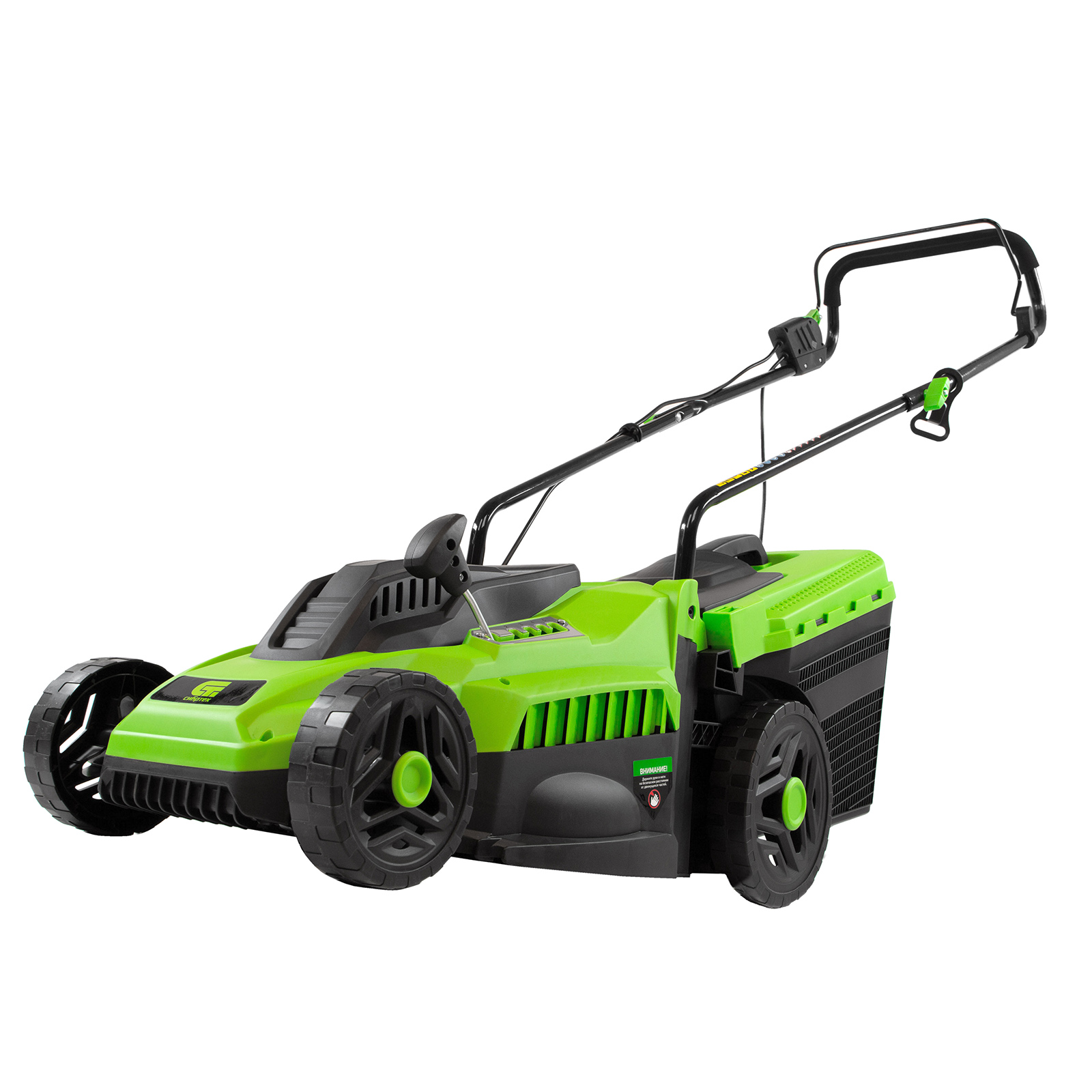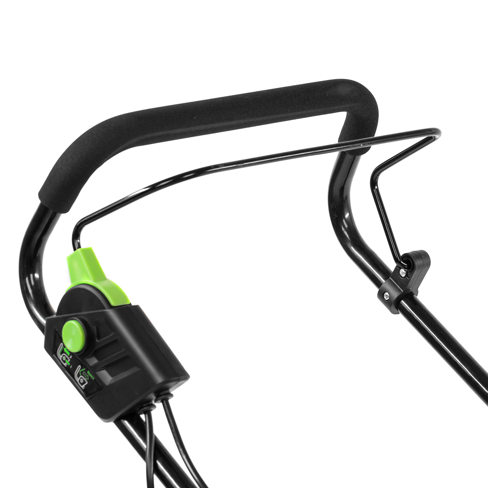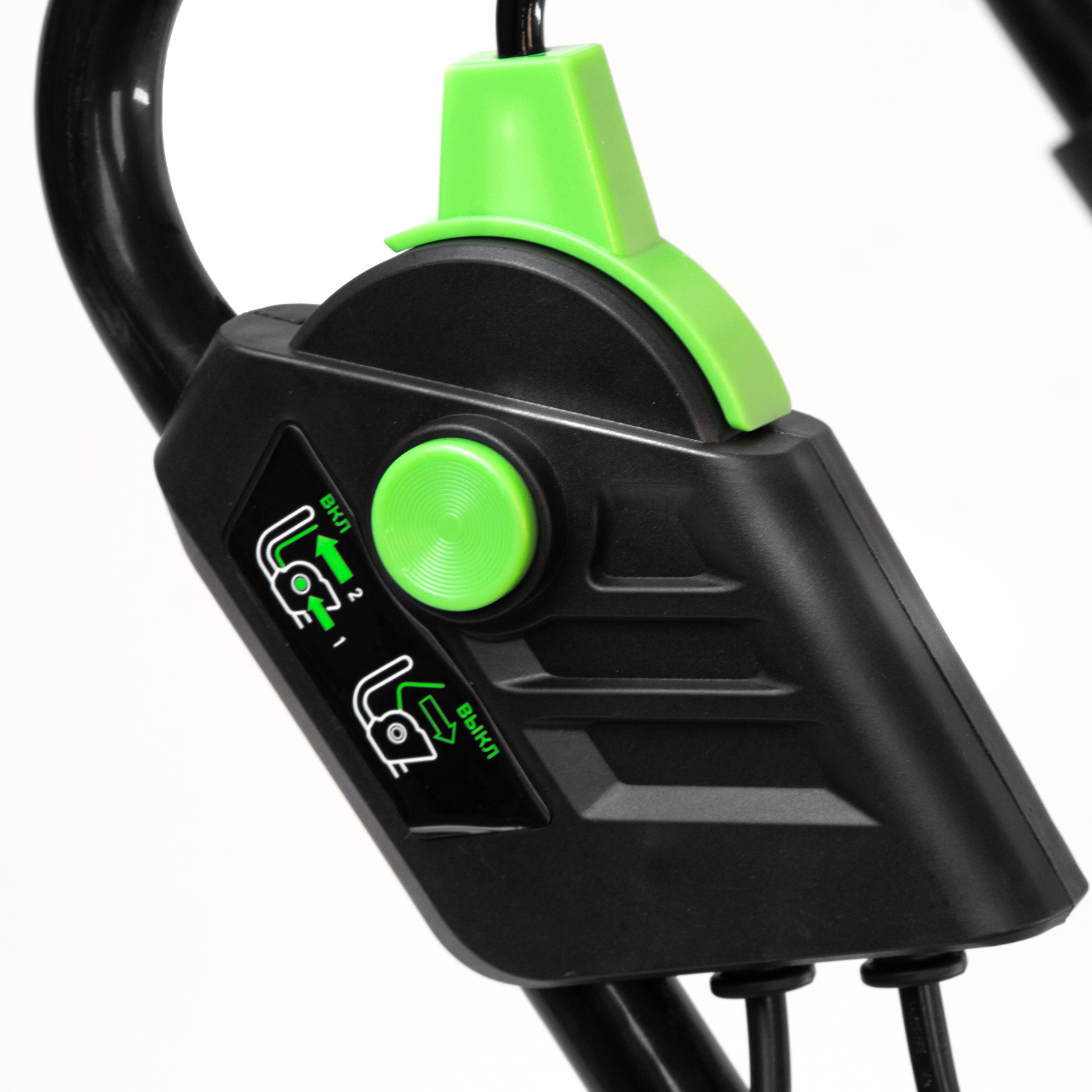 - Комфортная эксплуатация — для управления используется скоба, а не рычаг, как на большинстве электрокосилок, что делает работу удобной, особенно для левшей.