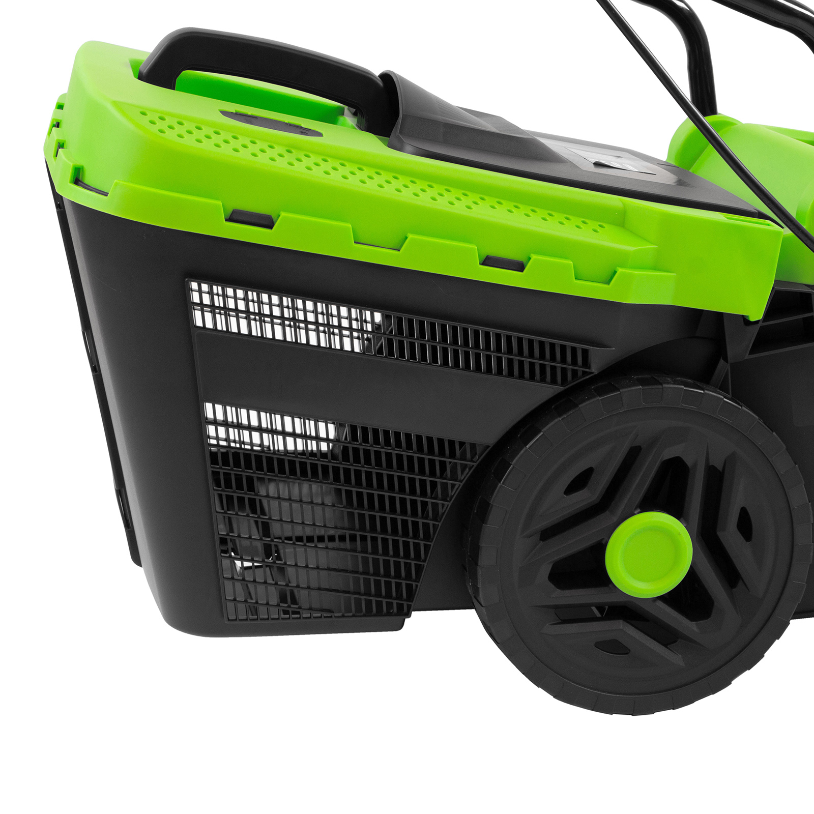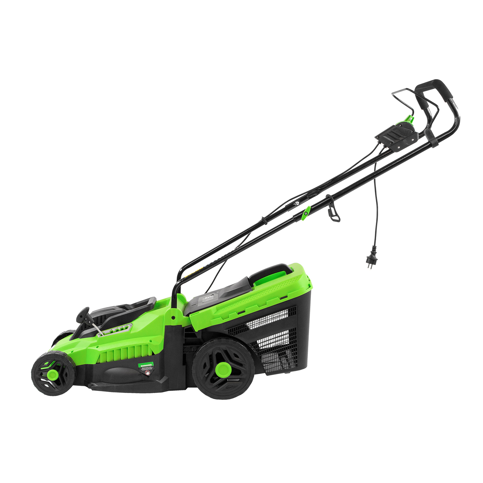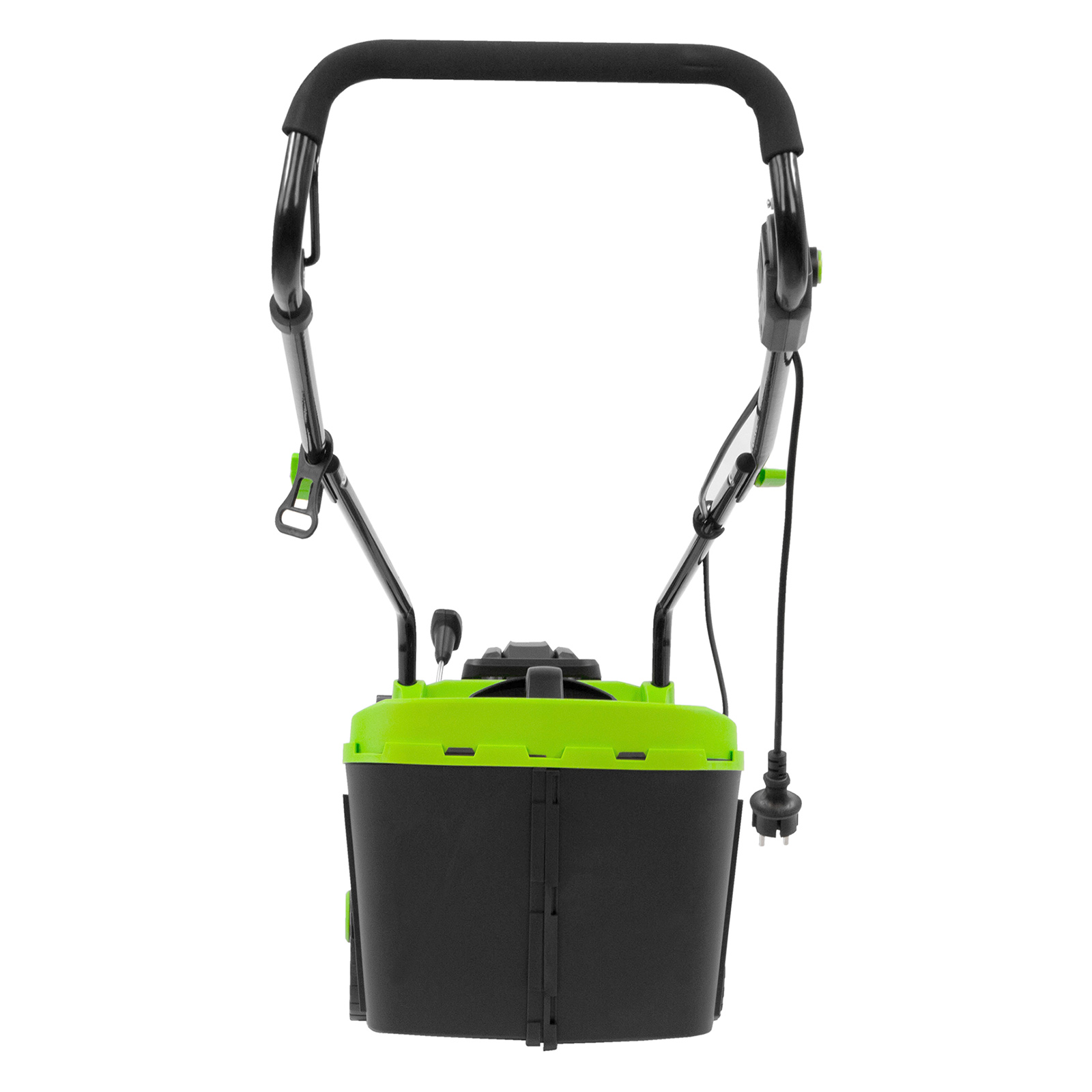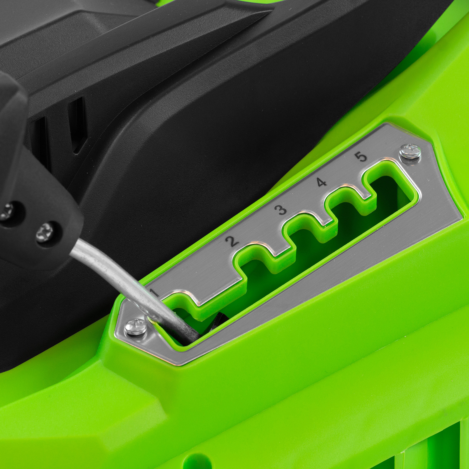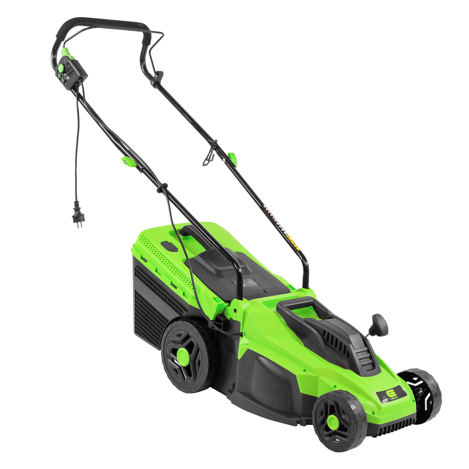 - Комфортная эксплуатация — для управления используется скоба, а не рычаг, как на большинстве электрокосилок, что делает работу удобной, особенно для левшей.