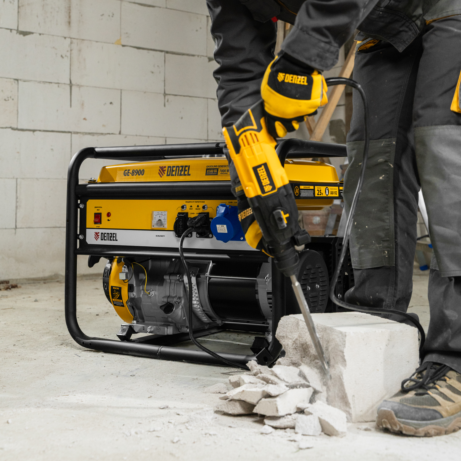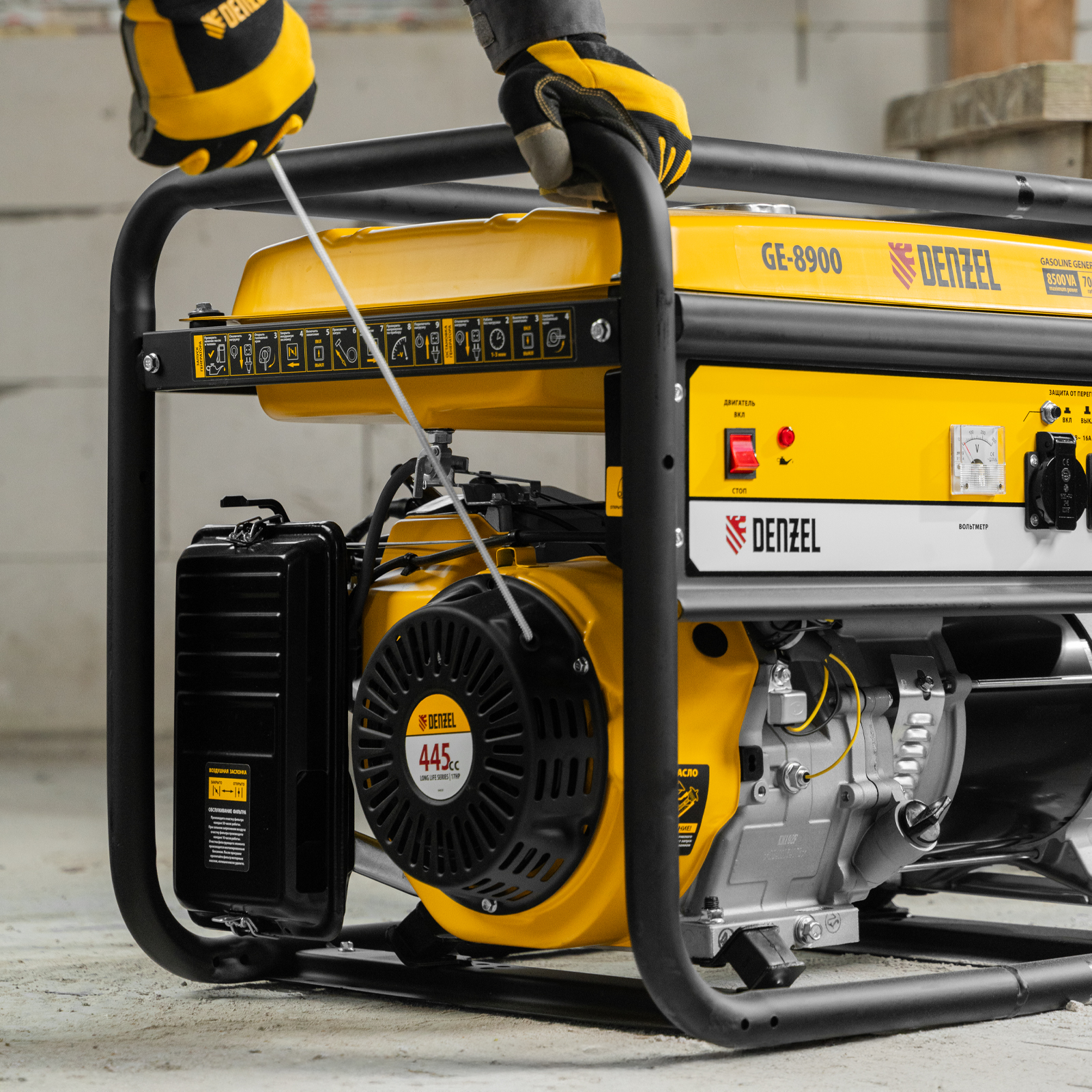 Бензиновый генератор Denzel GE 8900 94639, 220 В / 50 Гц, с баком на 25 л и ручным стартом, вырабатывает 8,5 кВт и способен обеспечить электричеством большой загородный дом, магазин или строительную площадку. Можно запитать сразу несколько потребителей, например, обогреватель или кондиционер, насос и электроинструменты. Силовая розетка позволяет подключать оборудование высокой мощности. Полного бака хватает на 7,8 ч работы без дозаправки.