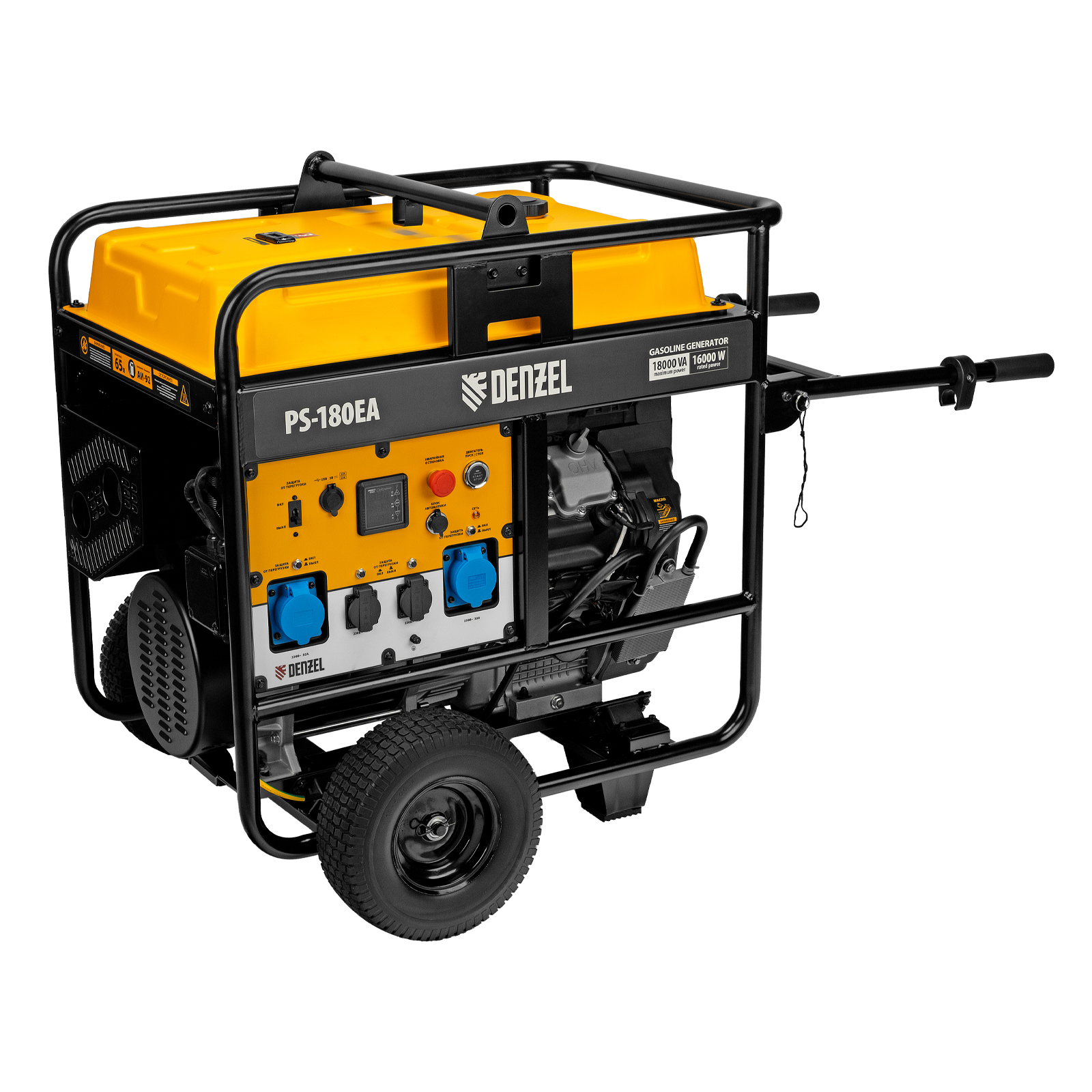 Бензиновый генератор Denzel PS-180EA 946974 максимальной мощностью 18 кВт, с баком объемом 65 л, разъемом ATS и электрическим стартером, поддерживает напряжение в сети 230 В. Предназначен для обеспечения питанием приборов и оборудования в случае отсутствия стационарной сети или перебоев в ее работе. Разъем USB 5 В позволяет заряжать мобильные устройства. Подключение потребителей производится при помощи 2-х розеток 230 В/16 А, а также 2-х силовых розеток 230 В/32 А.,Для работы с мощным оборудованием можно воспользоваться возможностью прямого подключения кабелей через распределительную коробку. Генератор пригодится в загородном доме, на производстве или строительной площадке.