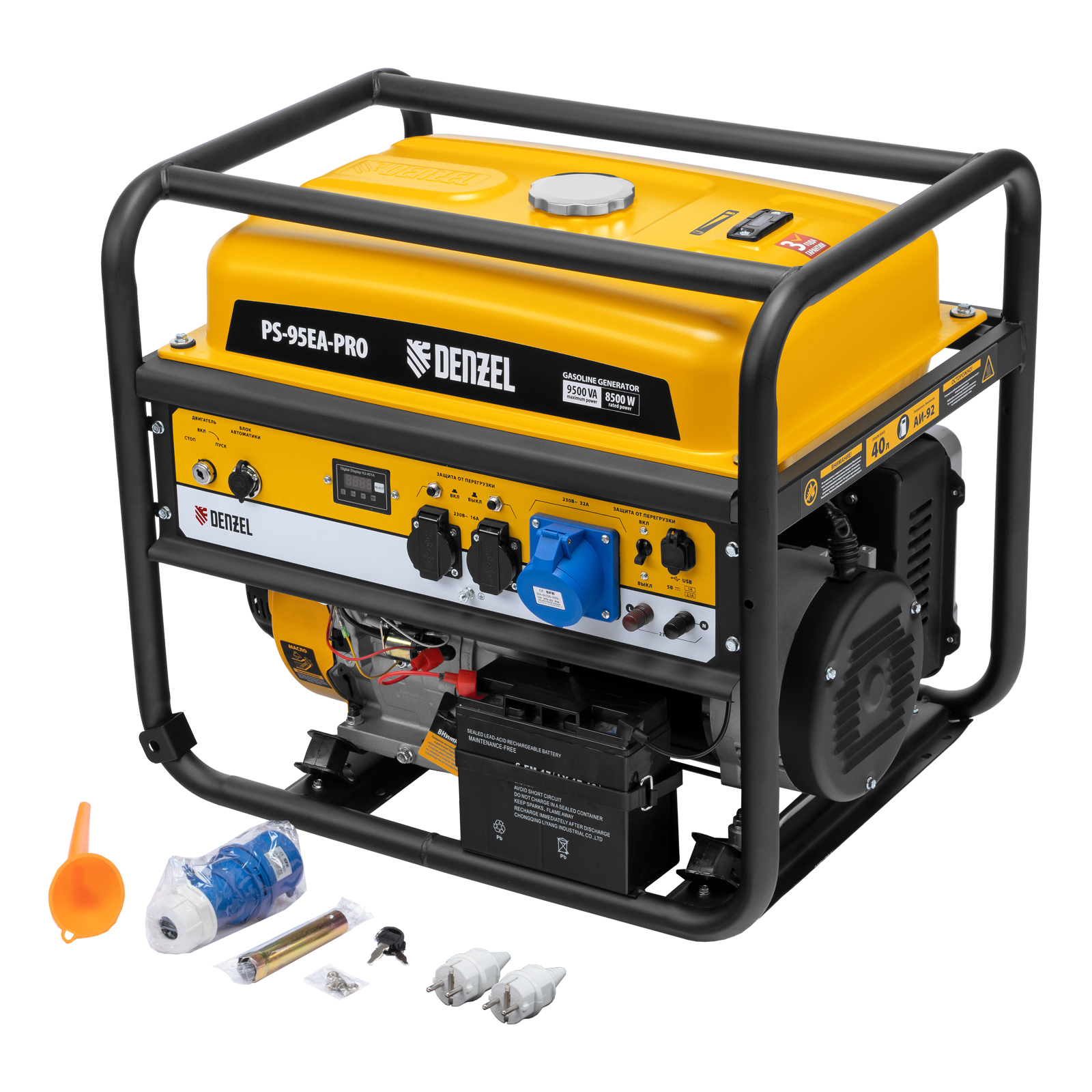 Бензиновый генератор Denzel PS-95EA-PRO 946935 максимальной мощностью 9,5 кВт, с баком объемом 40 л, разъемом ATS и электрическим стартером, поддерживает напряжение в сети 230 В и способен выдавать 8,5 кВт номинальной мощности благодаря двигателю увеличенного объема 485 см3. Предназначен для обеспечения энергией электроинструмента, бытовой и садовой техники, незаменим в загородном доме и на строительной площадке.,Подключить приборы можно при помощи 2-х евророзеток 230 В/16 А с индивидуальными предохранителями, для мощного оборудования предусмотрена силовая розетка на 32 А. Есть возможность снять полную мощность — для этого предназначены силовые клеммы. Благодаря двойному выходу постоянного тока USB 5 В можно вовремя подзарядить мобильные гаджеты.