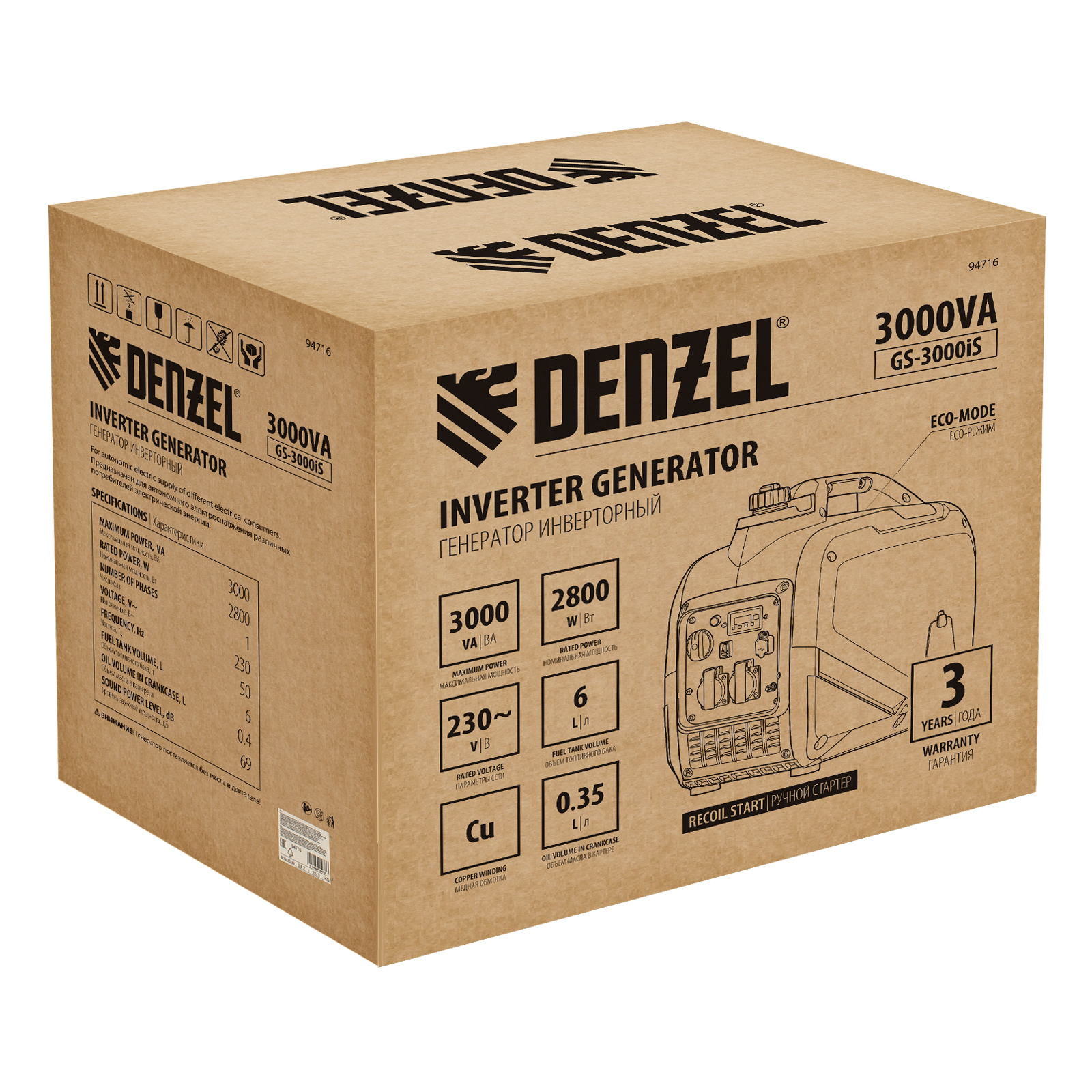Генератор инверторный GS-3000iS, 3,0 кВт, 230 В, закрытый корпус, ручной старт DENZEL в Уфе