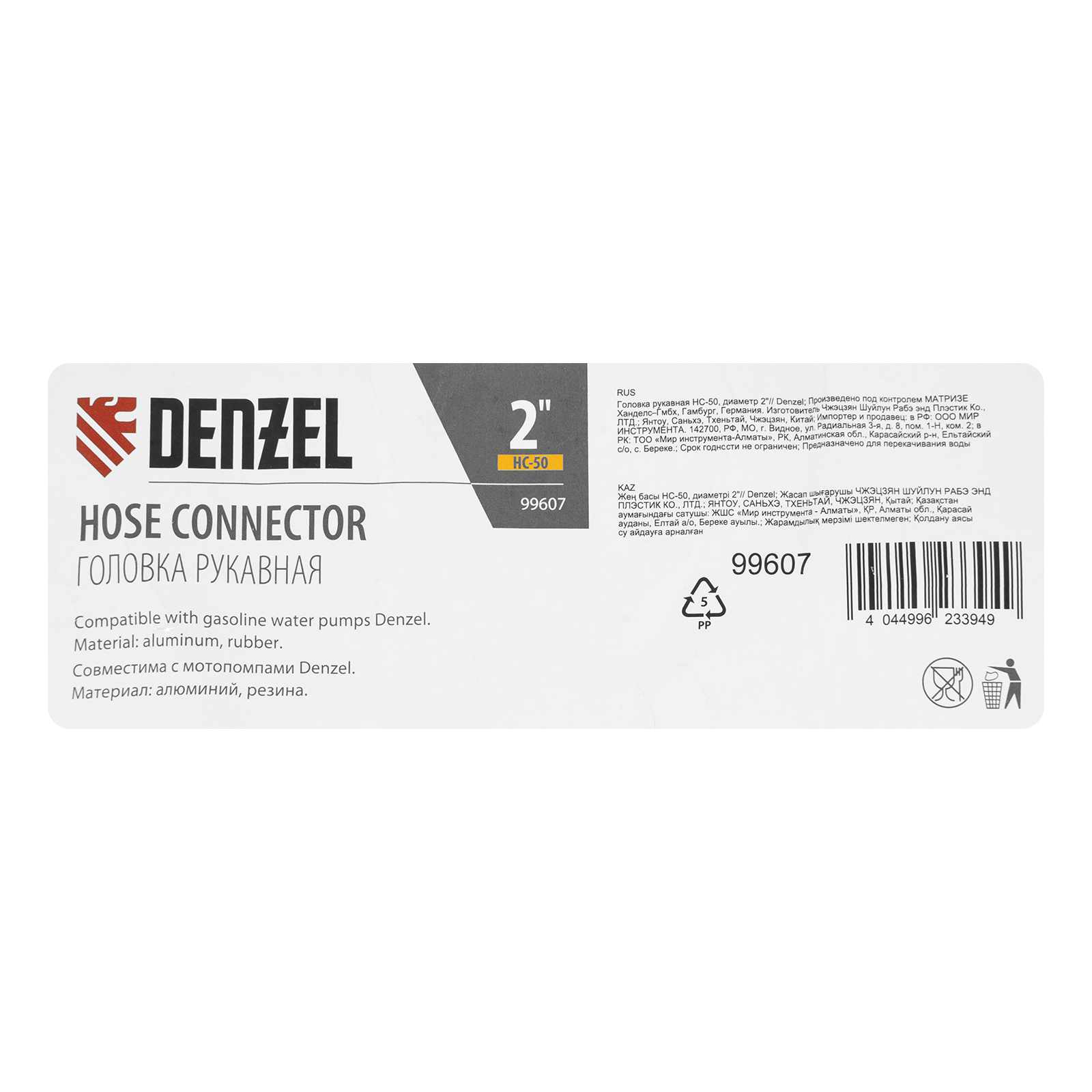 Рукавная головка Denzel HC-50 99607 с присоединительным диаметром 2" предназначена для подключения напорного рукава к выходному патрубку мотопомпы, а также для соединения шлангов между собой. Подходит к моделям Denzel 99201 и 99203. Используется для организации систем полива, водоснабжения, пожаротушения.