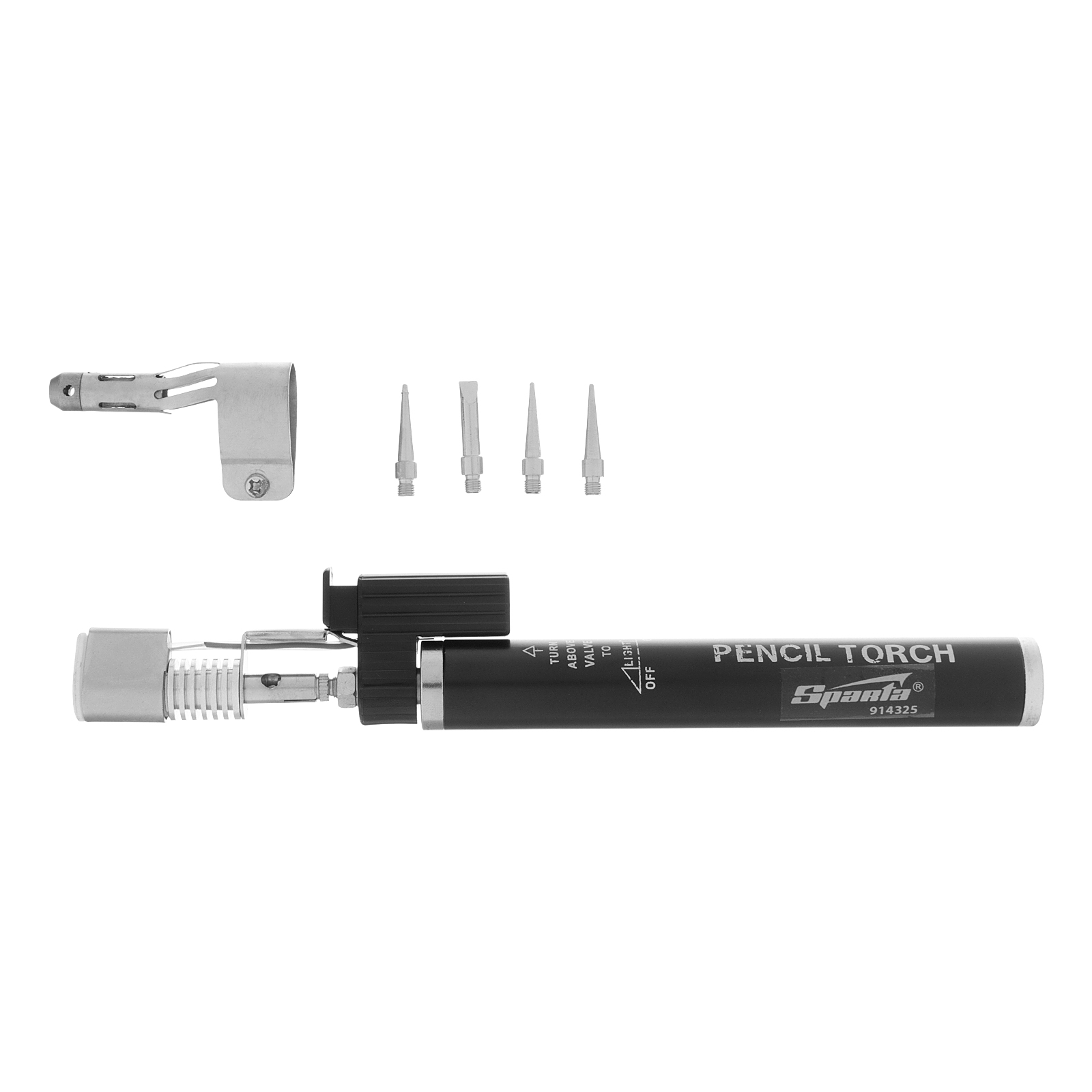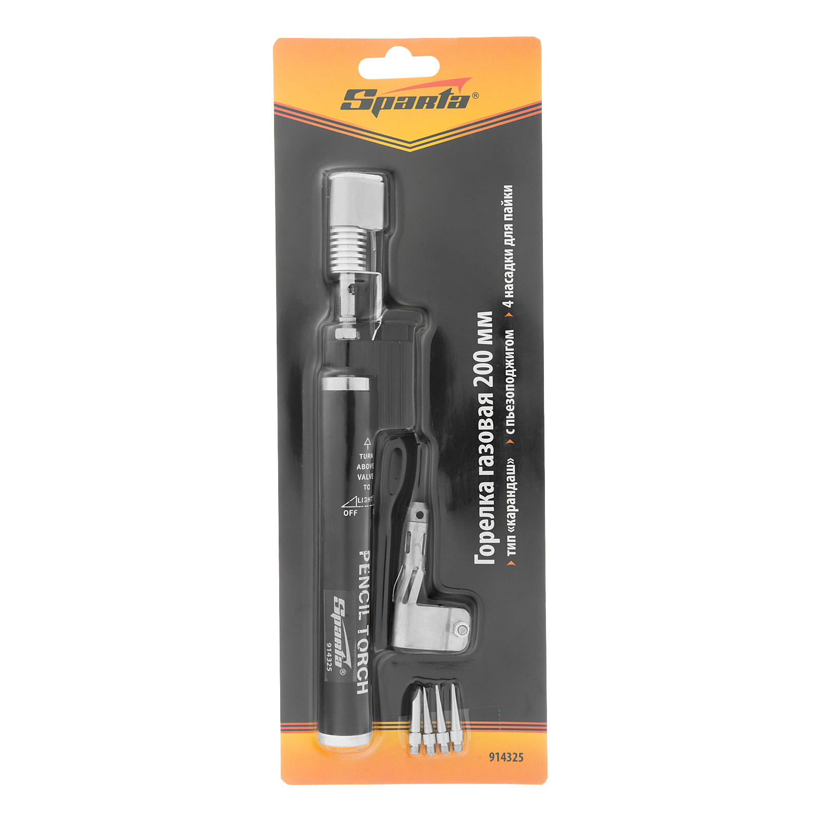 Газовая горелка Sparta 914325 типа «Карандаш», длиной 200 мм, с пьезоподжигом и 4 насадками, — портативный инструмент для пайки деталей и нагрева поверхностей. Включается моментально благодаря пьезоподжигу, позволяет получить устойчивое к ветру пламя. Пригодится домашнему мастеру, радиолюбителю или автовладельцу.