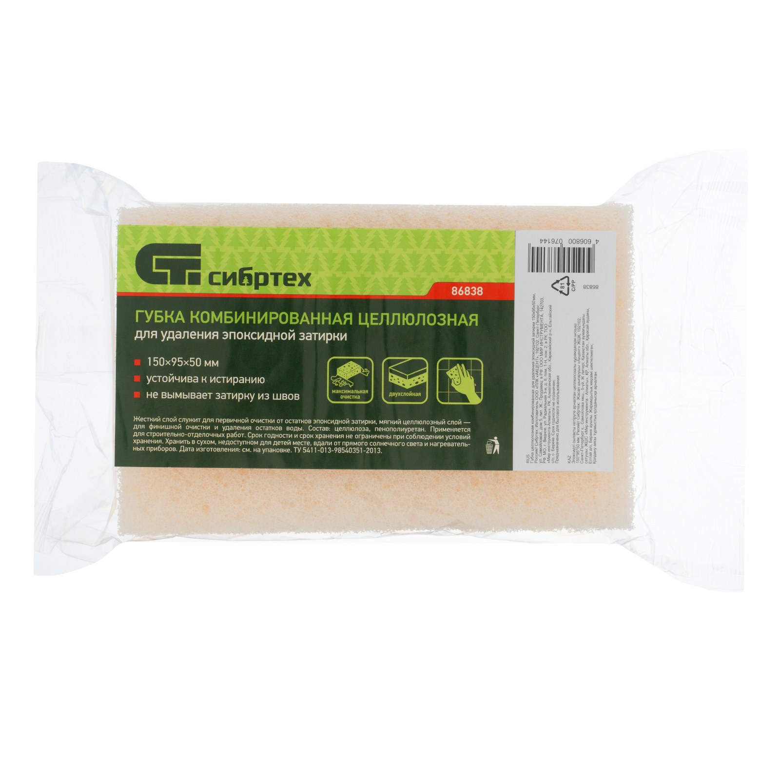 Целлюлозная комбинированная губка Сибртех 86838 размером 150 х 95 х 50 мм применяется для удаления излишков эпоксидной затирки. Она имеет двухслойную структуру: жесткий слой из ретикулированного поролона и целлюлозы используется для первичной очистки, а мягкий — для финишной обработки поверхности и удаления воды.