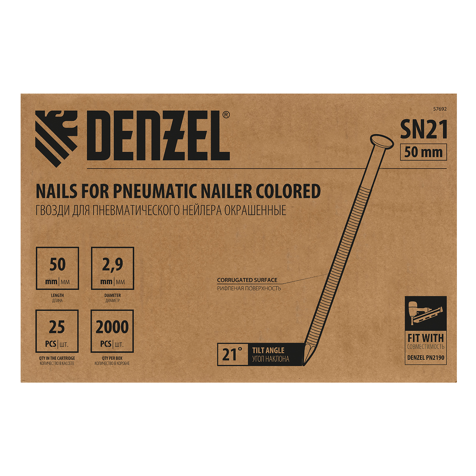 Гвозди Denzel 57692 типа SN21, длиной 50 мм и диаметром 2,9 мм, с крашеной поверхностью, 2000 шт. в упаковке, — расходники для пневматического нейлера. Используются для скрепления различных материалов, будут полезны во время сборочных и отделочных работ.