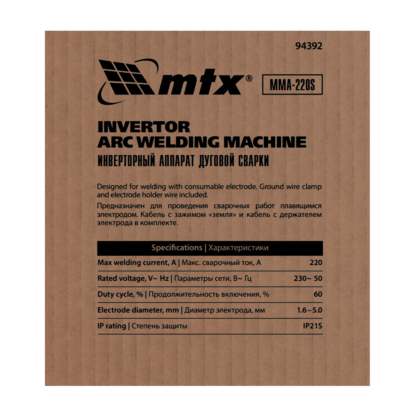 Инверторный аппарат MTX MMA-220S 94392 предназначен для дуговой сварки изделий из низкоуглеродистой стали с помощью штучных электродов диаметром 1,6-5 мм. Сварочный ток плавно регулируется в диапазоне 20-220 А, продолжительность включения (ПВ) на максимальном токе составляет 60%. Аппарат позволяет эффективно выполнять поставленные задачи даже при нестабильном напряжении. Оптимально подходит для использования в частных хозяйствах, будет полезен сотрудникам ЖКХ и работникам аварийно-ремонтных бригад. Отличается низким уровнем шума.
