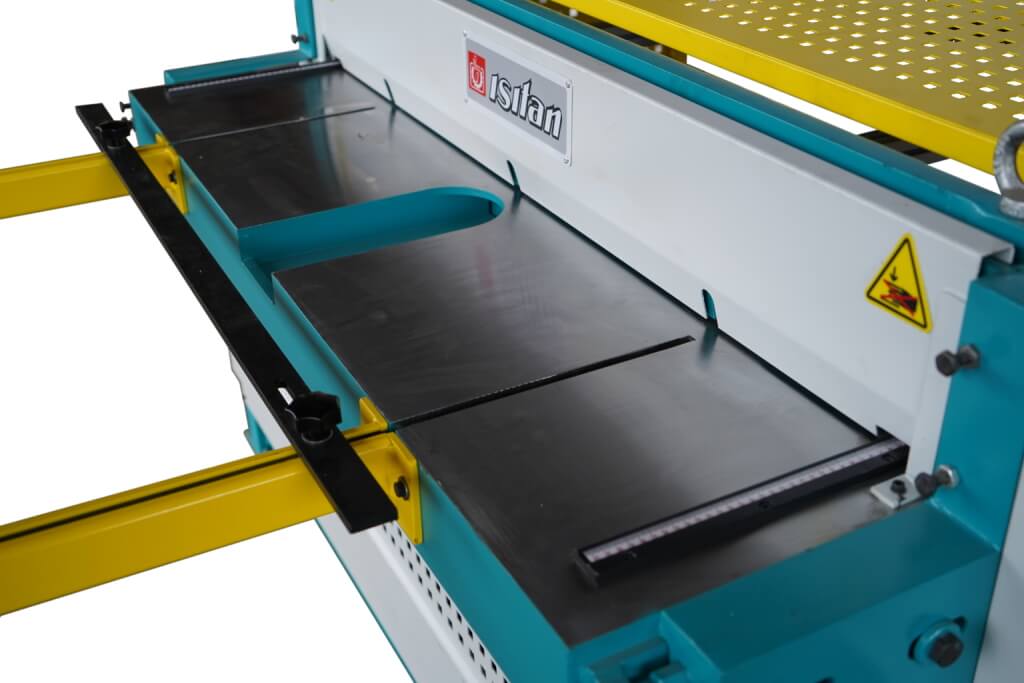 - Регулируемые передние упоры, позволяющие резать широкие куски листа;