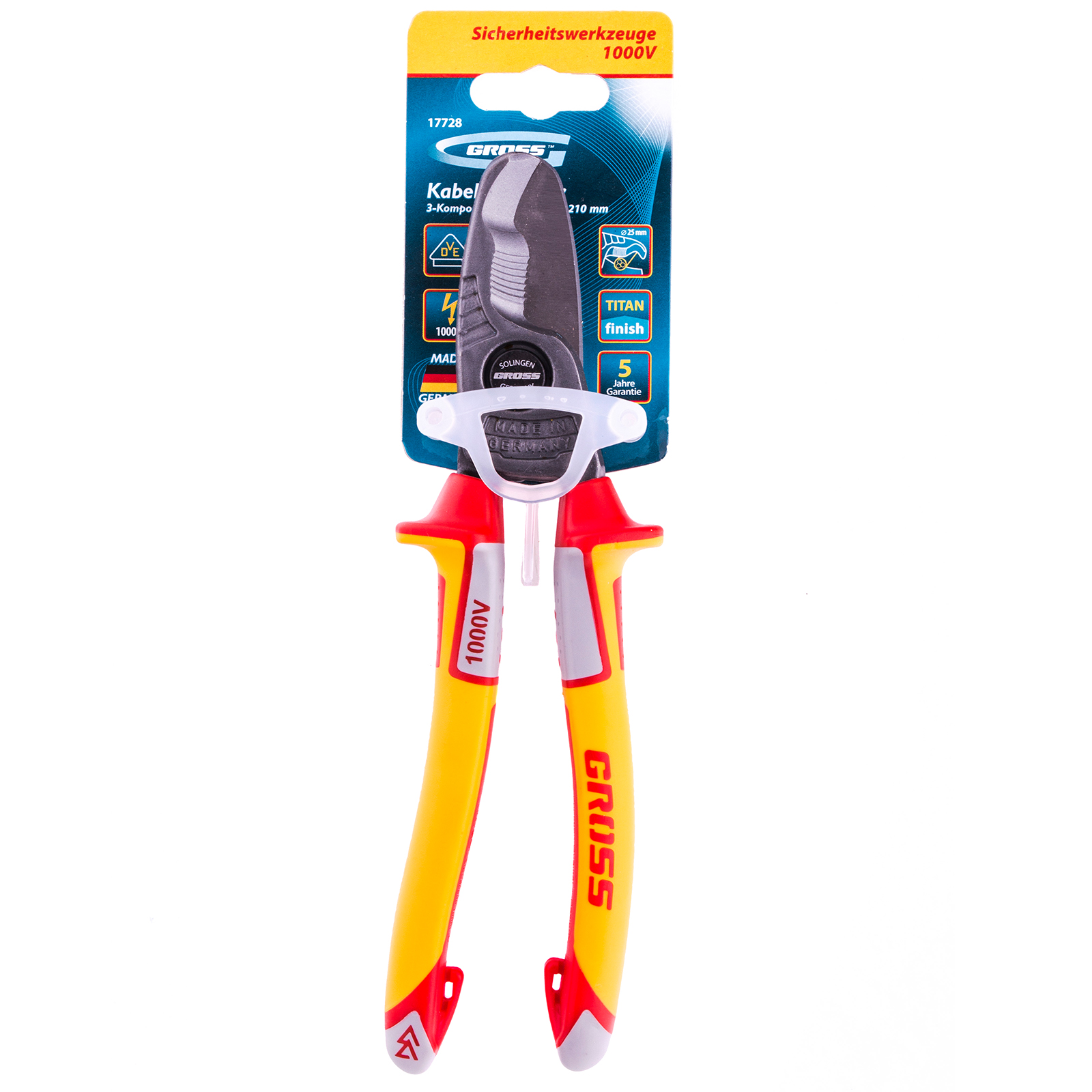 Кабелерез Gross 17728 длиной 210 мм, с диалектическими рукоятками до 1000 В, широко используется при проведении слесарных и электромонтажных работ. С его помощью можно перерезать многопроволочную жилу из меди и алюминия, снять изоляцию с электропроводов. Важно — работа под напряжением не допускается, инструмент не подходит для работы с алюминиевыми сплавами, стальной проволокой и холоднотянутыми медными проводами, может использоваться только для многопроволочных жил (общий диаметр кабеля не более 25 мм, сечение до 70 мм2).